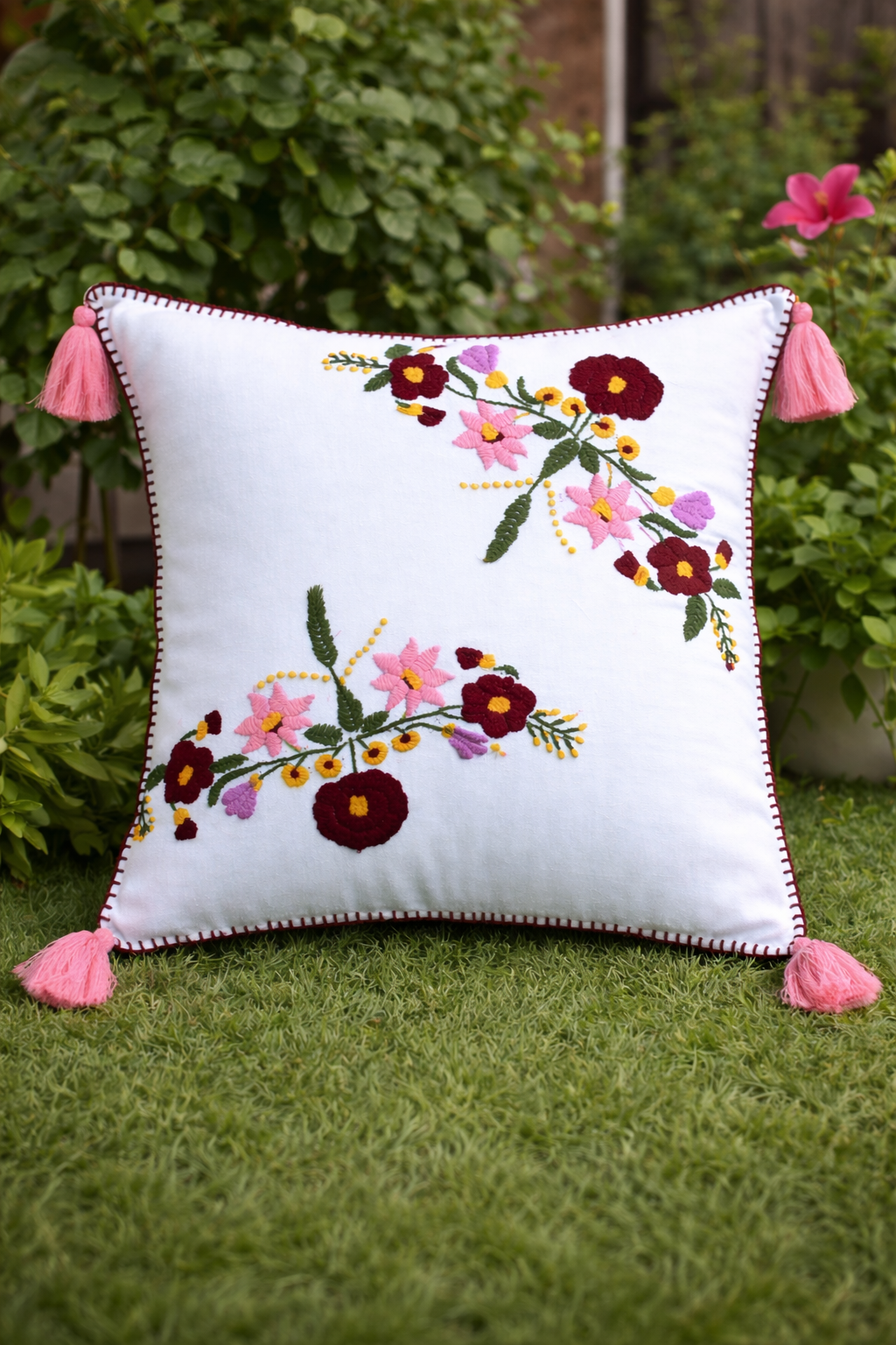 Handmade Floral Embroidered Cotton Cushion Cover with Tassels | Decorative Sofa Pillow Cover Product Description