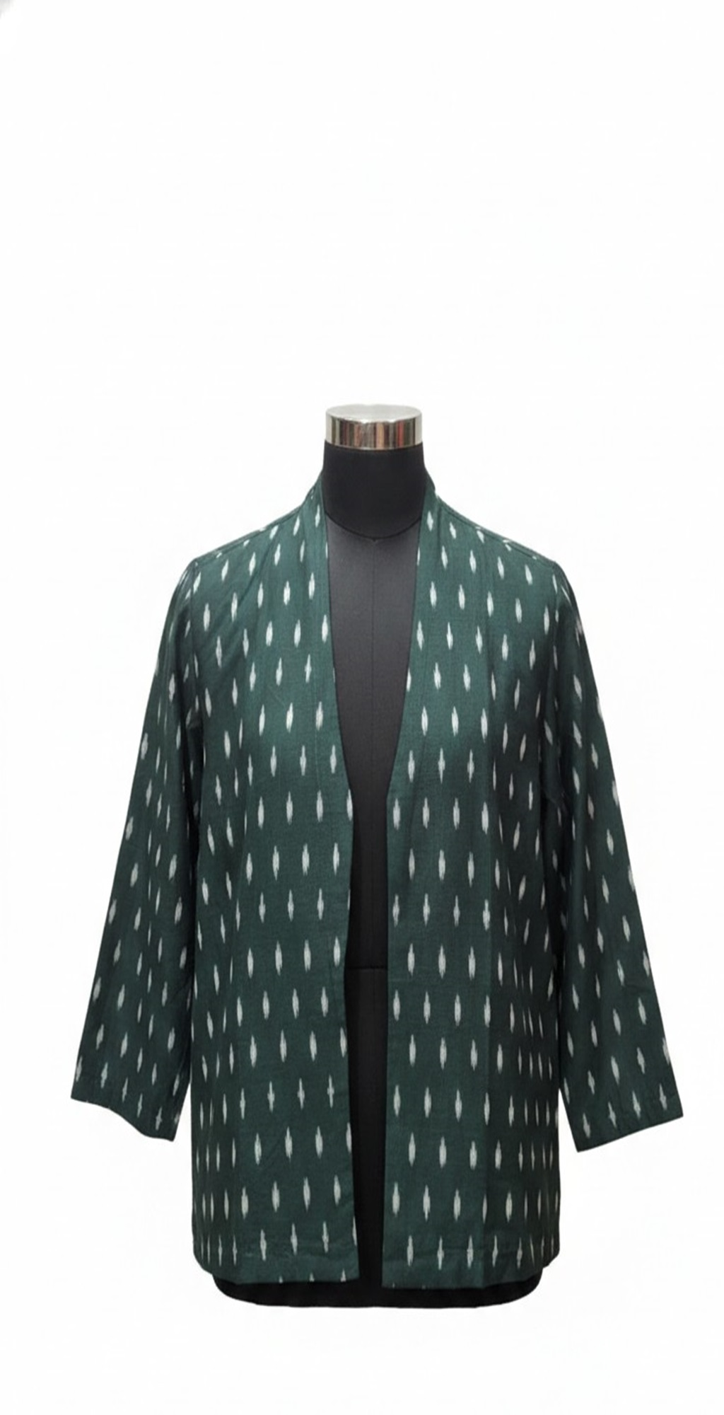 Each piece is meticulously hand-loomed by master artisans, ensuring that no two garments are exactly alike. This open-front coat features a deep forest green base, accented by a rhythmic white Ikat teardrop motif. The fabric is 100% hand-spun cotton, offering a breathable yet structured feel that transitions beautifully through the seasons. Its clean, minimalist lines and slightly cropped sleeves provide a sophisticated drape that complements any outfit. Elevate your sustainable wardrobe with our Handmade Emerald Ikat Shrug, a masterpiece of traditional craftsmanship meeting modern silhouette.