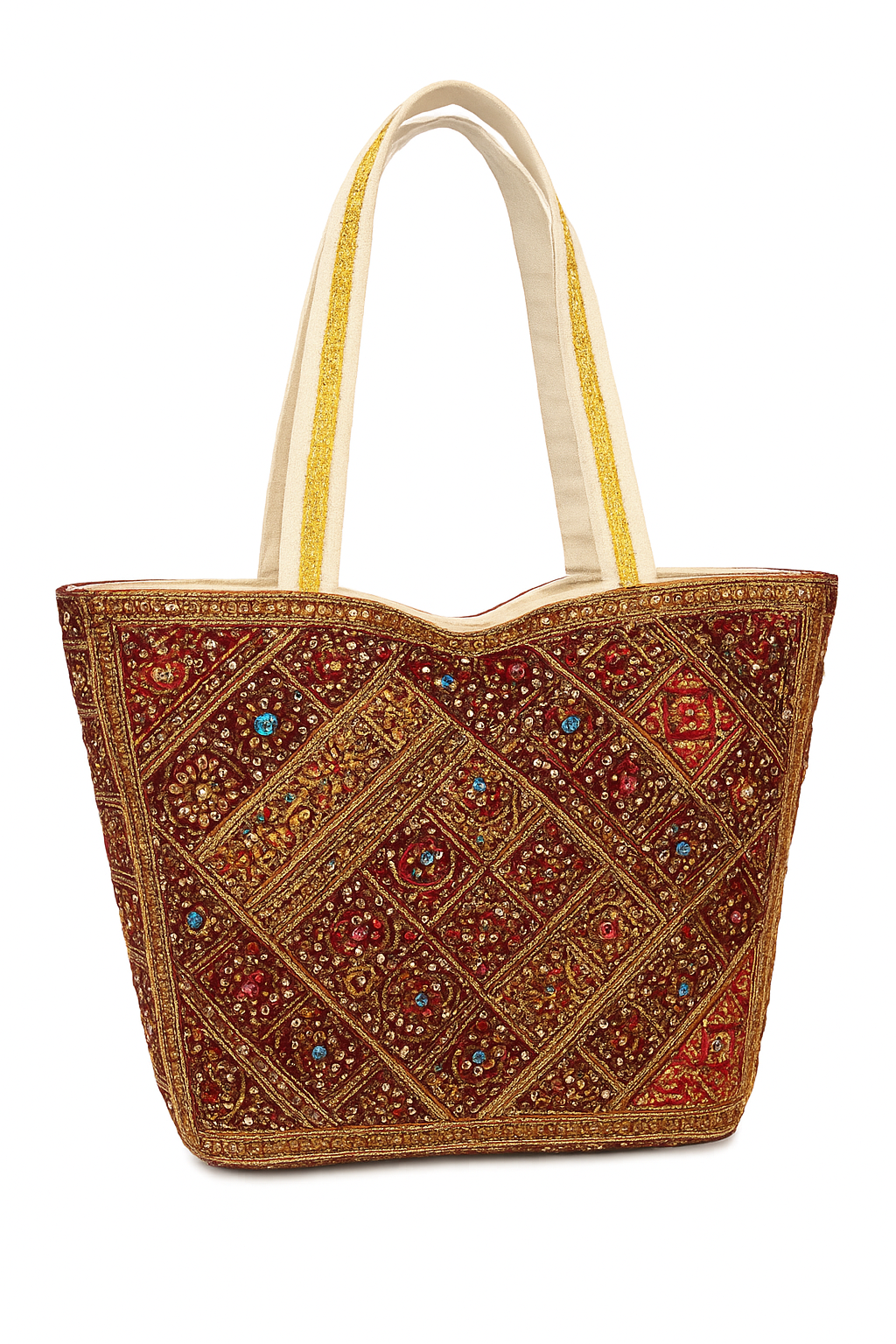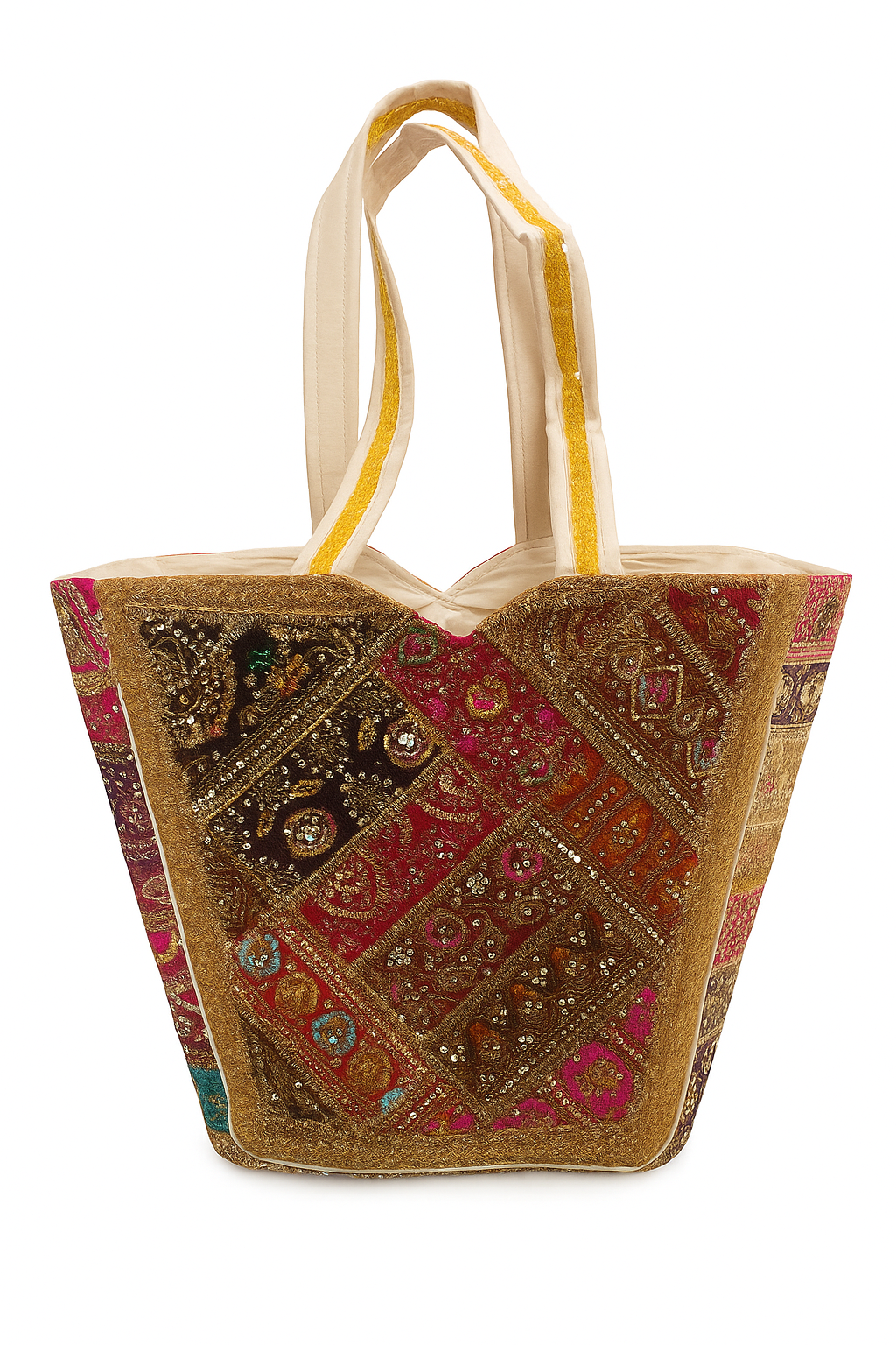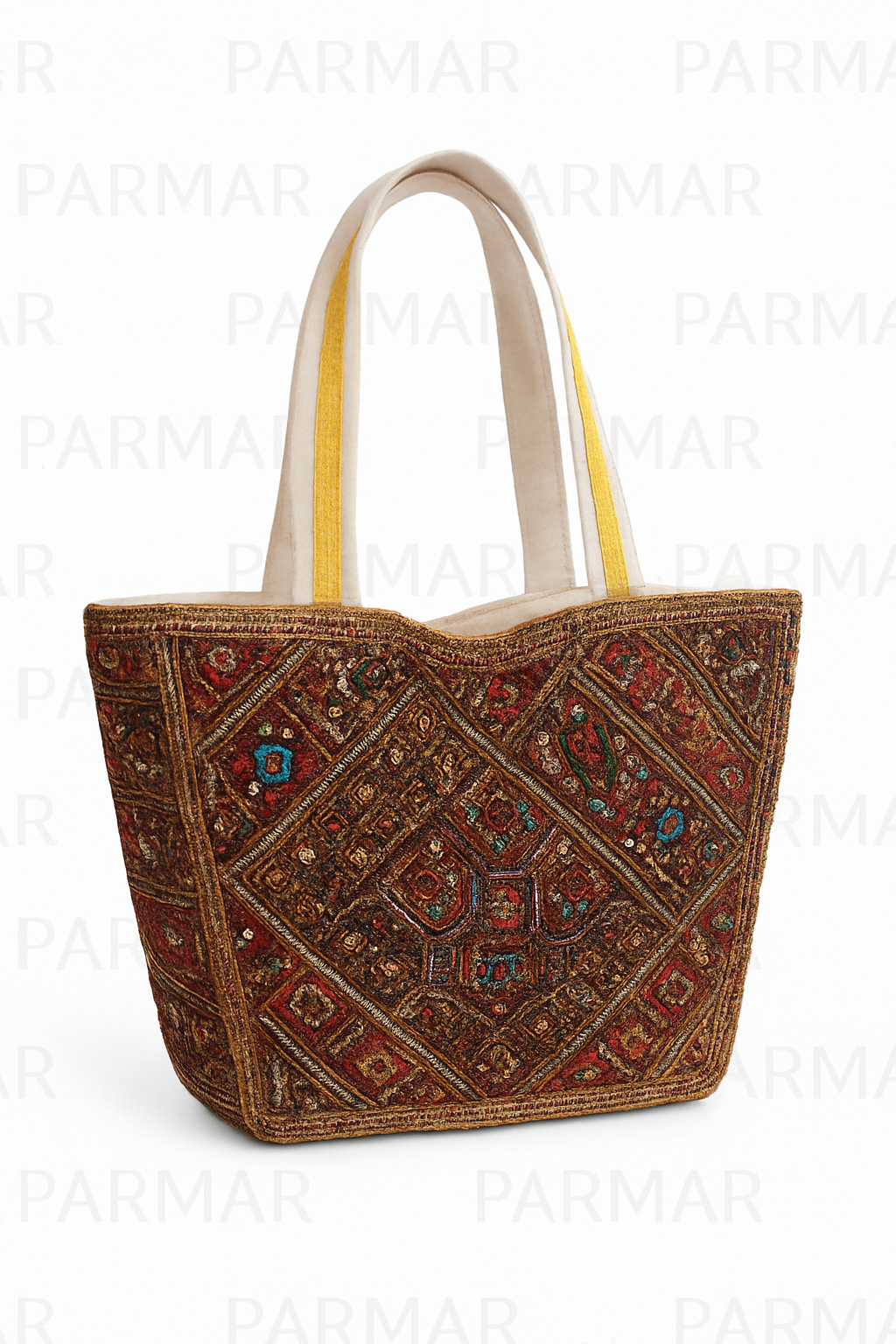 Handmade Jari Zardozi Dabka Embroidered Tote Bag for Women | Ethnic Patchwork Shoulder Handbag | Traditional Party & Bag