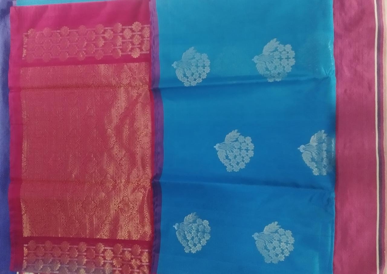 The Kora Cotton Saree is also known as kora cotton sarees which are woven in Kongu Belt of Tamilnadu viz. Coimbatore, Tiruppur and Erode districts of Tamilnadu. Dyed mulberry raw silk yarn (Kora) is used in warp and superior quality mercerized cotton yarn is used in weft giving crisp handle with elegant look. The Sarees have bright coloured border designs with occasional use of shining jari. They are woven on fly shuttle raised pit looms fitted with jacquard mechanism.