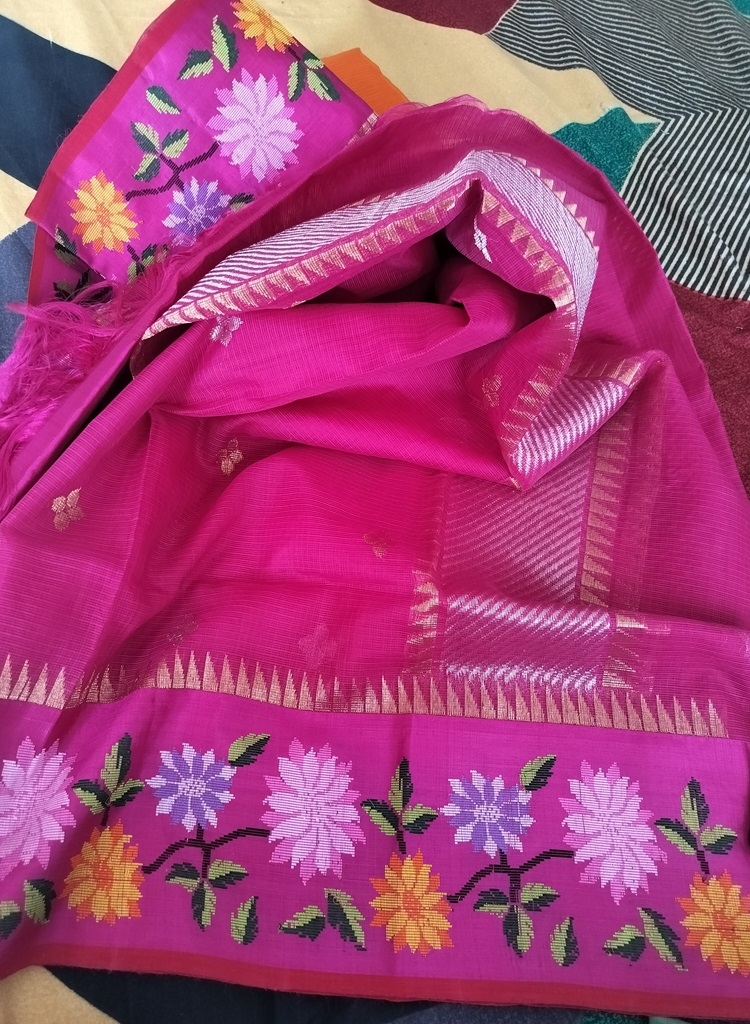 This dupatta is presented in a rich, vibrant rani pink/fuchsia hue that makes a bold statement. The borders are exquisitely highlighted with two distinct forms of embellishment: Hand Embroidery: The edges feature beautiful, colorful floral embroidery (likely Phulkari or a similar folk style) showcasing chrysanthemums and other blooms in shades of yellow, purple, and green. Real Zari Work: The pallu (end border) is intricately woven with bands of shimmering real zari (metallic thread), creating a sophisticated, festive shimmer. The delicate gold threadwork adds a touch of royal luxury, perfect for formal occasions. Finished with a delicate fringe/tassel detail, this dupatta is a testament to the weaver's and artisan's skill. Pair it with a simple suit to instantly elevate your look for weddings, festivals, or special events.