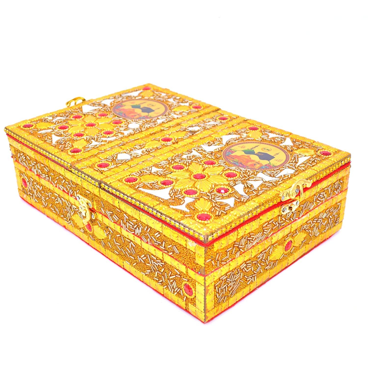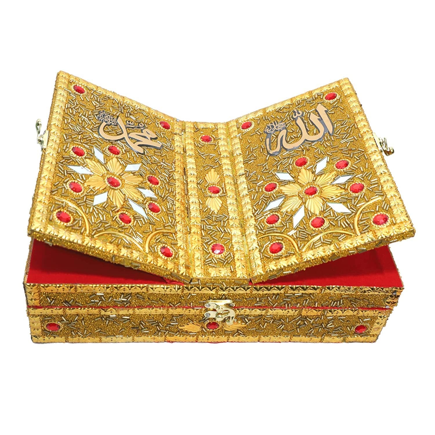 The Handmade Quran Box with Foldable Wooden Rehal features exquisite golden beads work and traditional craftsmanship. It serves as both a holy book storage box and reading stand, offering convenience and elegance. Crafted from premium wood, it ensures durability and beauty, making it ideal for daily prayers, Ramadan, Eid gifts, or home décor.