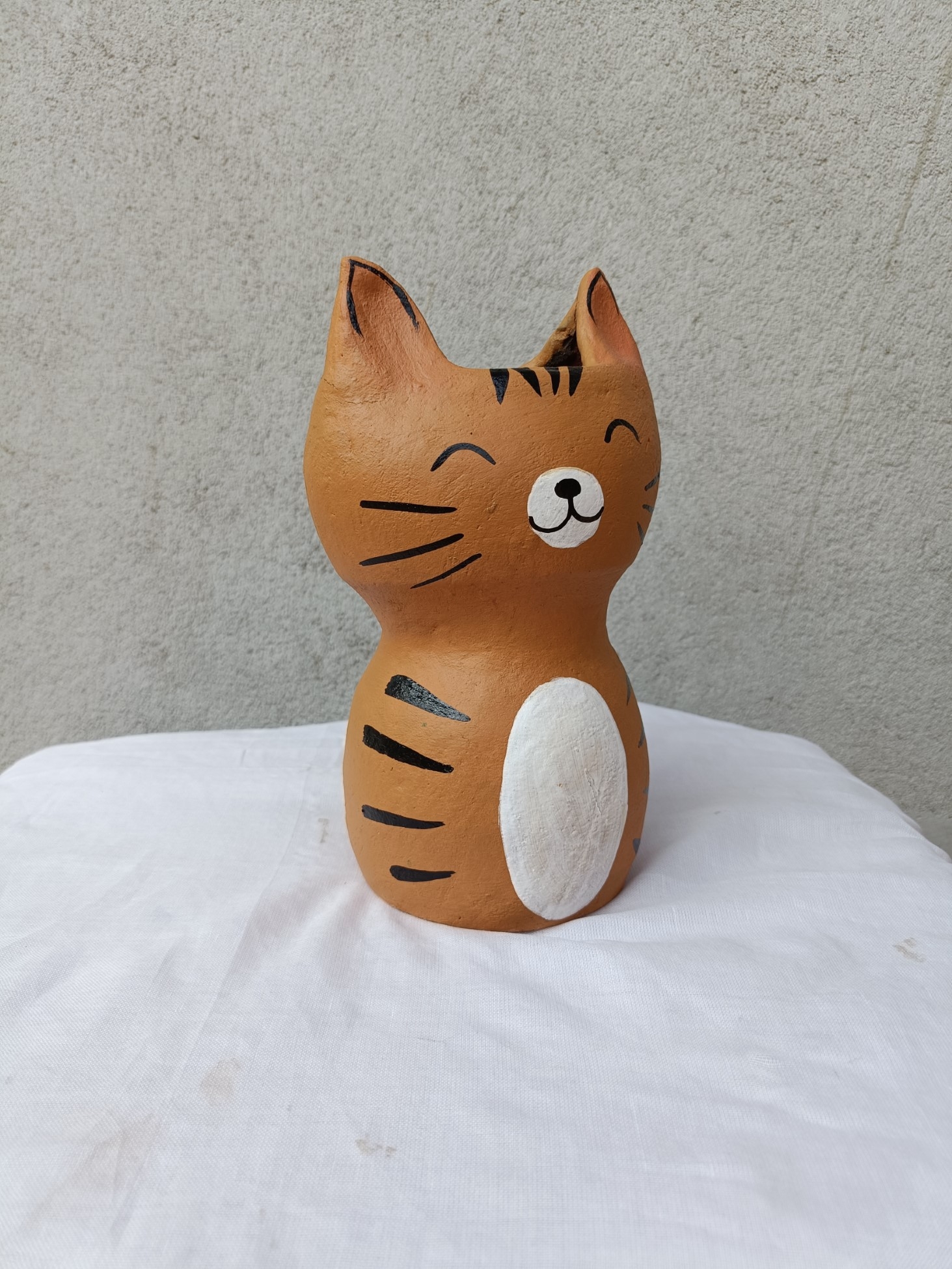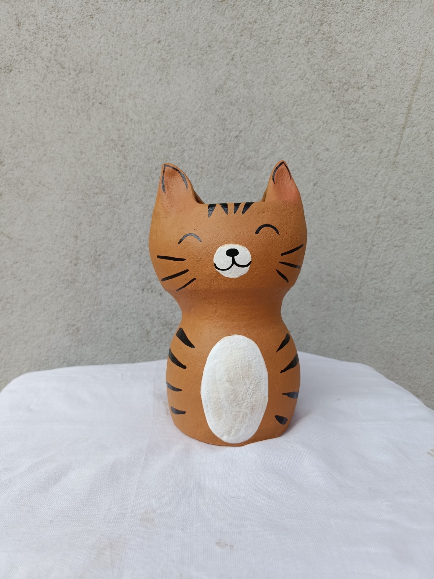 This charming handmade terracotta cat pen stand brings a delightful touch of whimsy to any desk or workspace. Crafted from natural terracotta clay, this adorable orange tabby features hand-painted details including distinctive tiger stripes, a sweet smiling face with closed eyes, whiskers, and a cream-coloured belly. The cat's upright design with perky ears creates a functional hollow space perfect for holding pens, pencils, paintbrushes, or other desk accessories.