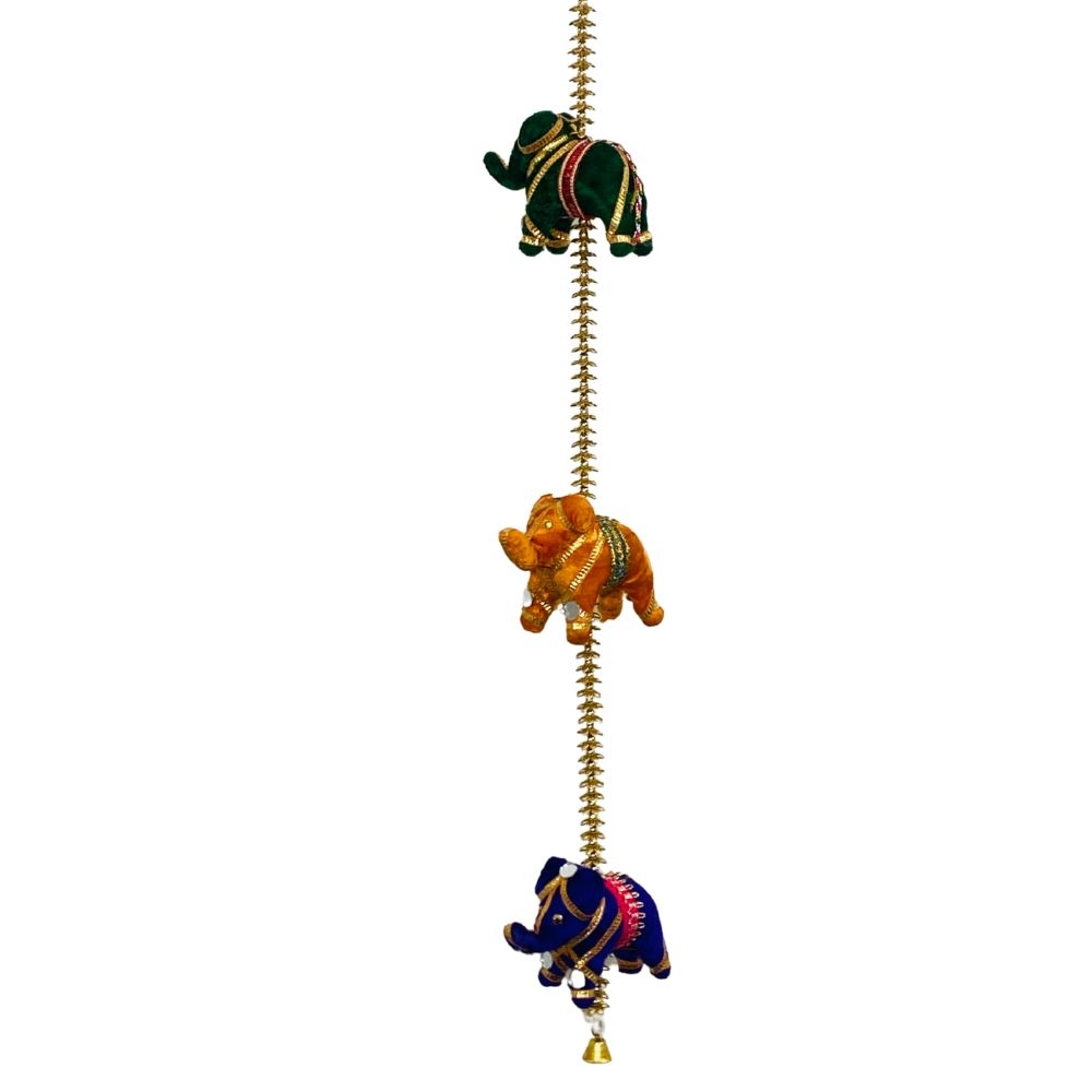 Bring home a touch of tradition and charm with this Handmade Elephant String, crafted in a luxurious velvet finish. Featuring colorful, hand-painted elephant figures, delicate pearl strands, and jingling metal bells, each piece reflects the intricate craftsmanship of skilled Indian artisans. Perfect for decorating doorways, windows, or walls, this string adds a vibrant, festive feel to any space.