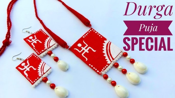 Hand painted swastik in red and white on cotton canvas fabric necklace set. Fully eco-friendly and light weighted necklace set . Cotton canvas, thread and immitation shells and other decorative items are used. Suitable for all types of traditional and western outfits. Unique look.