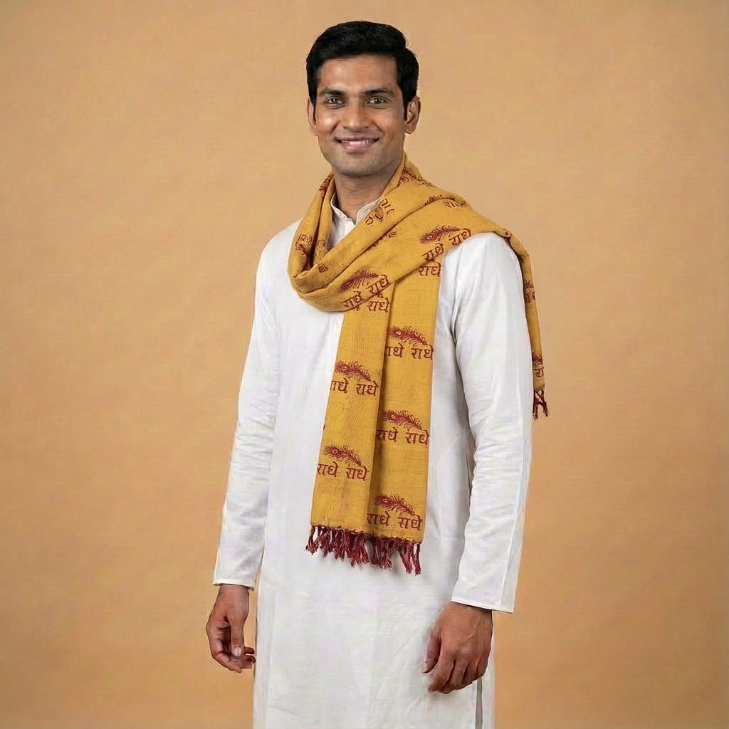 Handprinted Radhe Radhe Puja Gamcha|Yellow