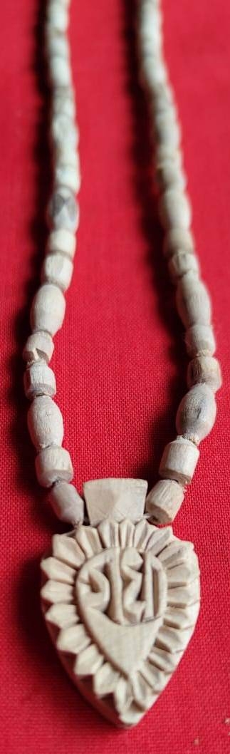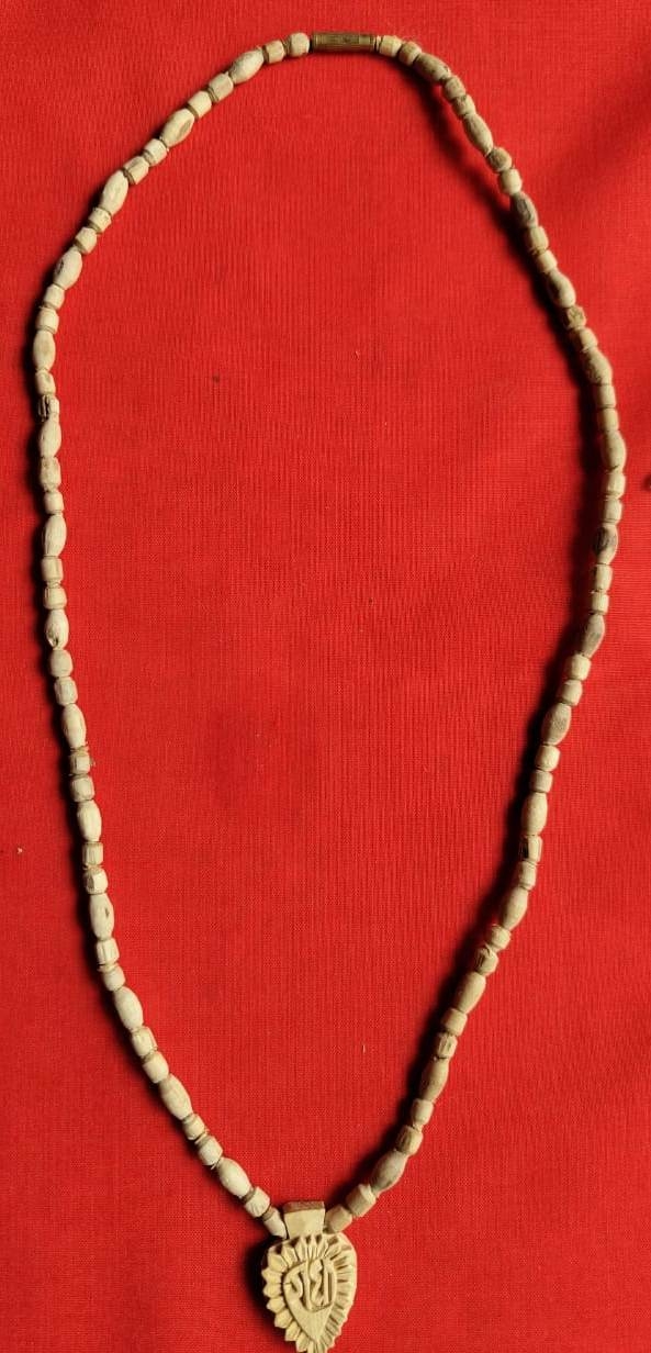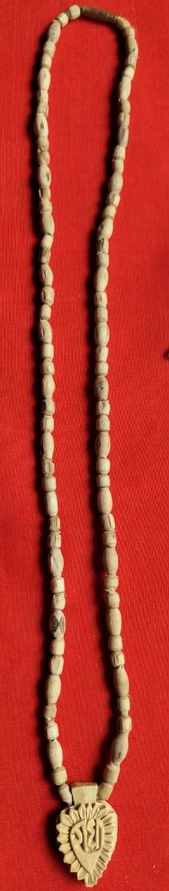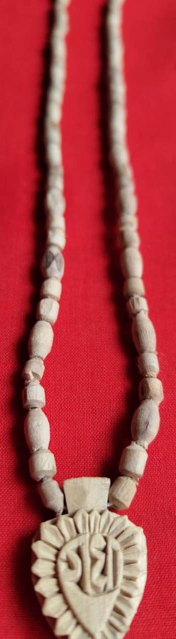 It is Single round neck Kanthi Mala with "Radha Locket" , 100% made from stem and root in Tulsi wood. Tulsi wood does produce by farming in Jait village mathura.  Jait village is origin of Tulsi production and Tulsi Kanthi is being made since more than 100 years in village.