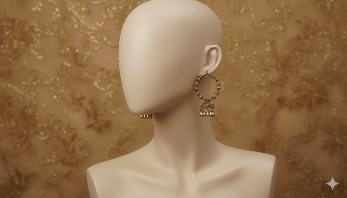 Apne ethnic look ko ek naya mod dein in khoobsurat aur unique style ke jhumkon ke saath. Ye earrings traditional jhumka aur modern hoop design ka ek behtareen mixture hain.