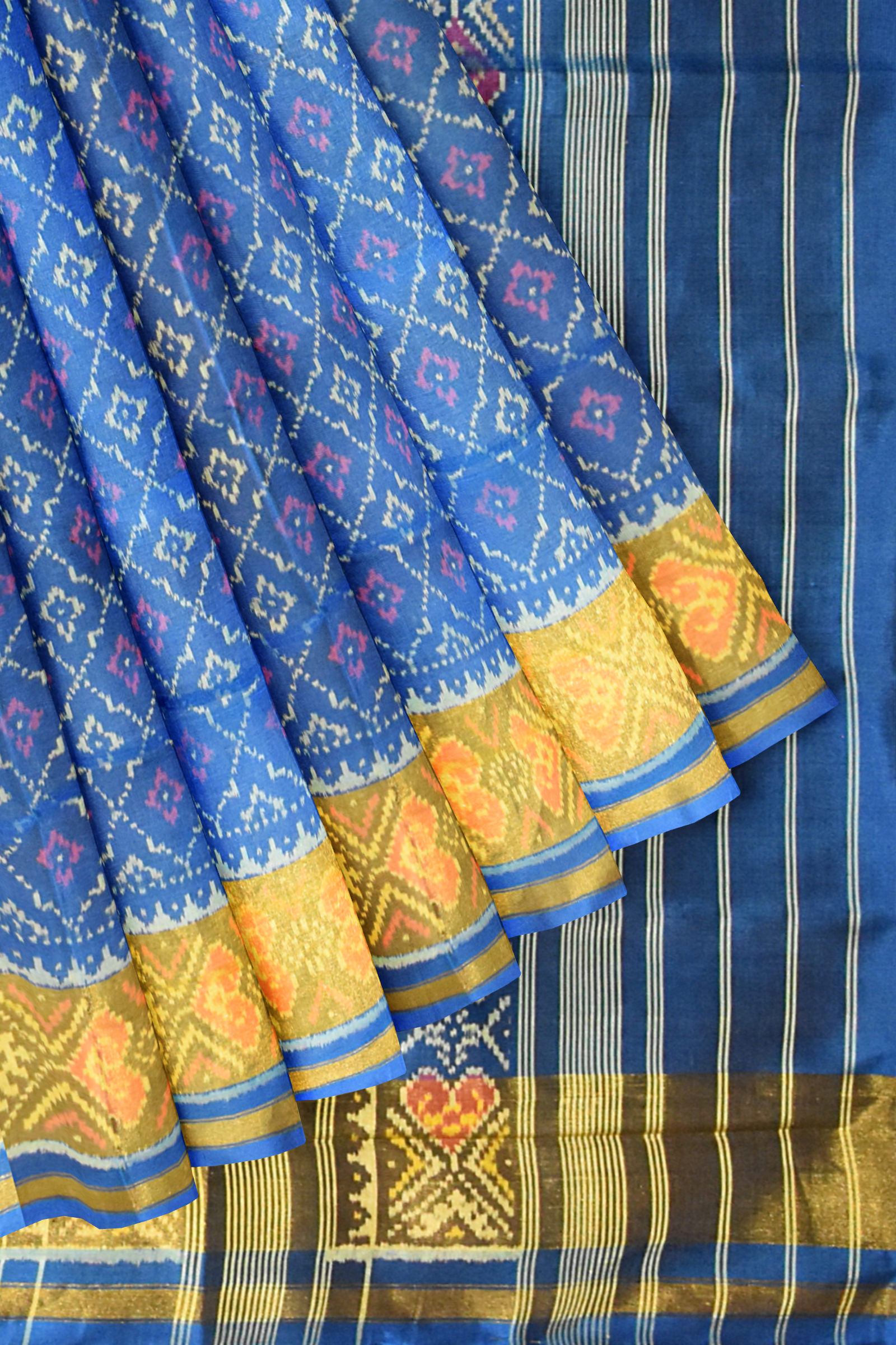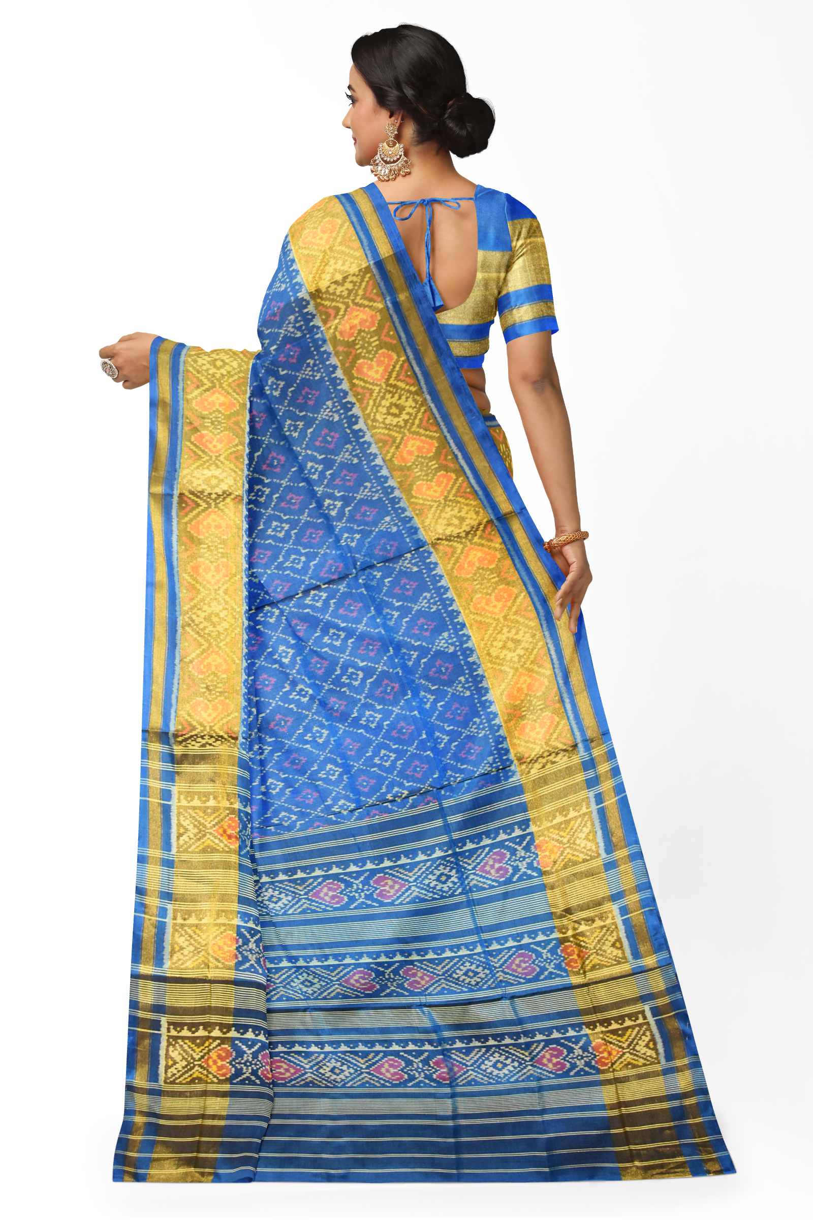 Single ikkat Patola silk saree Trqoise Blue mulberry silk handwoven saree from master weavers of Gujarat. Traditional ‘Modern design’ patterns are woven for this saree in shimmering dual shaded silk. The saree borders are highlighted with small zari interwoven as broad stripes. Showcasing magnificent design and crafted in pure silk features handwoven patola saree. Pair this saree with a beautiful blouse which will make you look elegant. It is handcrafted in pure Mulberry silk for utmost comfort and style.