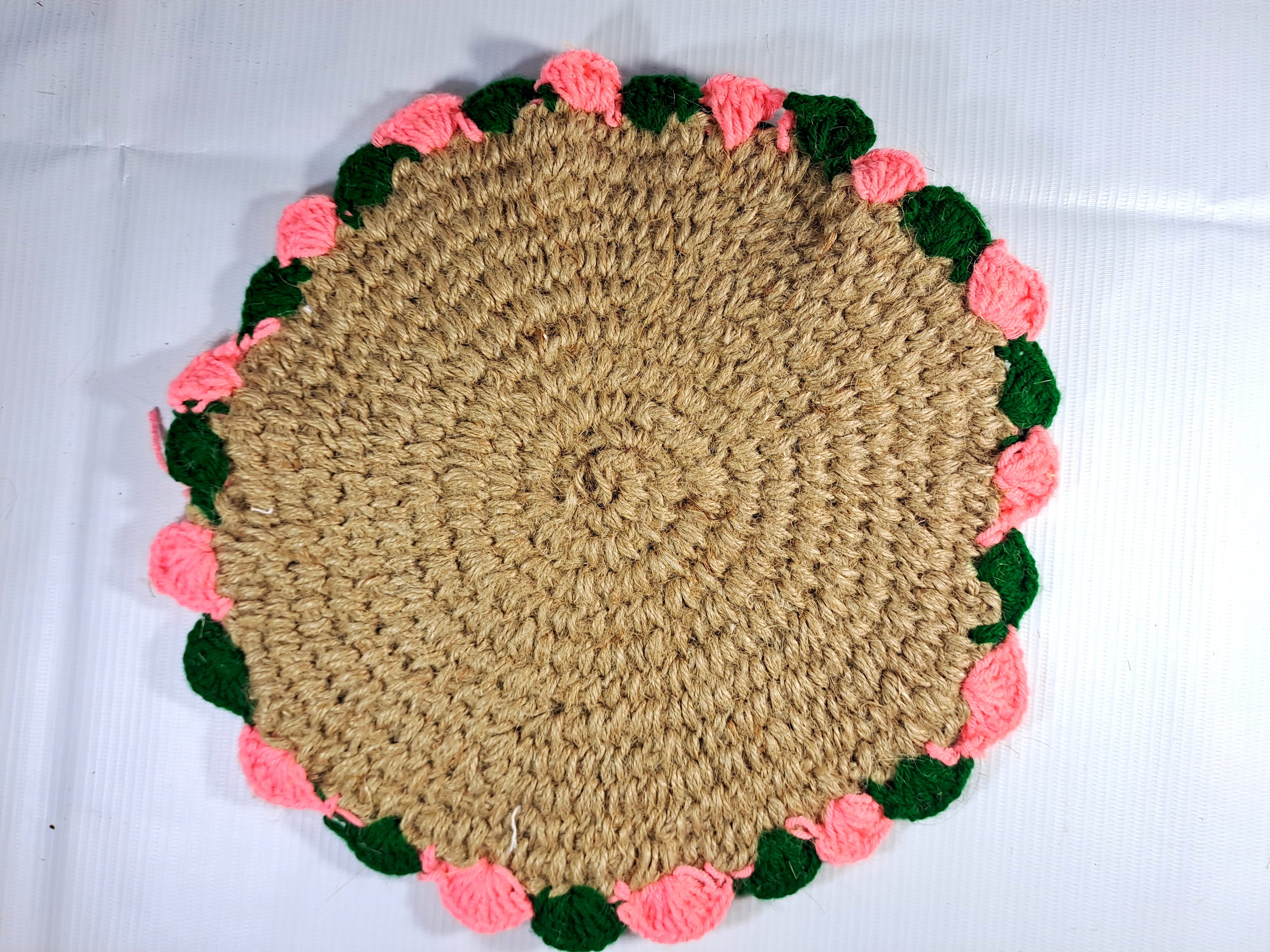 Introducing our exquisite Jute Telephone Mats, a harmonious blend of nature and craftsmanship, a round shape mat covering the border with Pink & Green colour, each handcrafted mat showcases intricate weaving and features charming design. Jute Braided round shaped placemats presented by our artisans a fascinating addition to your telephone equipment needs, adding panache and grace. The careful use of supreme quality materials allows us to create a product that matches your home decor needs for a long time. Product is made using natural Jute fibbers and braided efficiently to provide a smooth comfortable surface that can be versatile and efficient in use. A combination of exquisite colours, and modern design choices, provides an excellent option for purchasing. A beautiful home decorator that elevates your table space and adds some blissful delight to your home & office. An ideal gift for birthdays, anniversaries, house warming, diwali, christmas, eid or festive occasion.