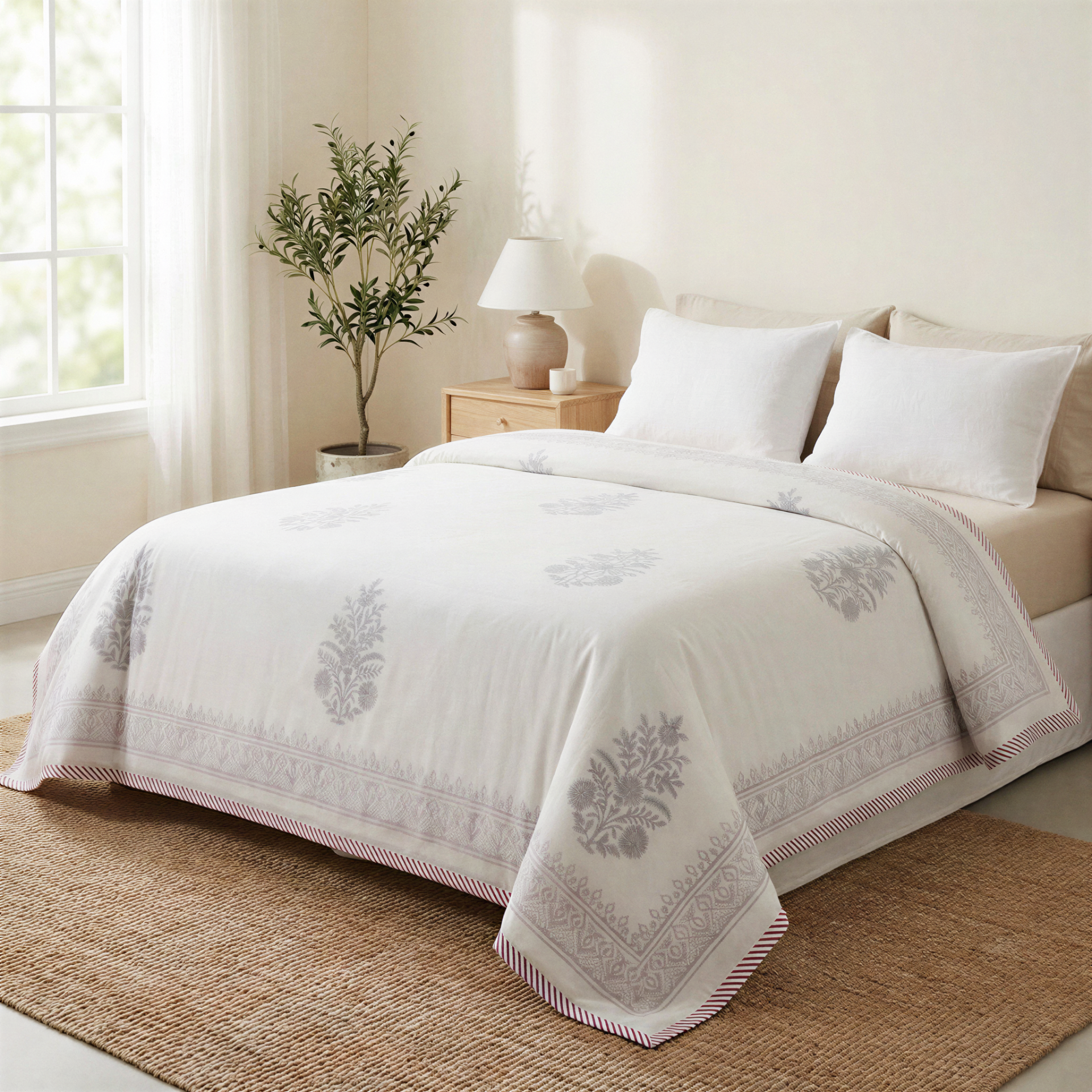 The understated elegance of this handcrafted cotton dohar will instantly uplift your bedding. Lovingly made by rural women artisans using traditional hand block printing techniques, it features a soft white base adorned with delicate, muted floral motifs scattered across the fabric, complemented by intricate geometric borders in light pastel tones. A contrasting maroon diagonal stripe edging frames the design, adding a refined touch to its subtle beauty. Lightweight and breathable, this dohar is perfect for air-conditioned rooms, summer nights, and mild winters. Crafted from 100% pure cotton, it offers lasting comfort and timeless style.