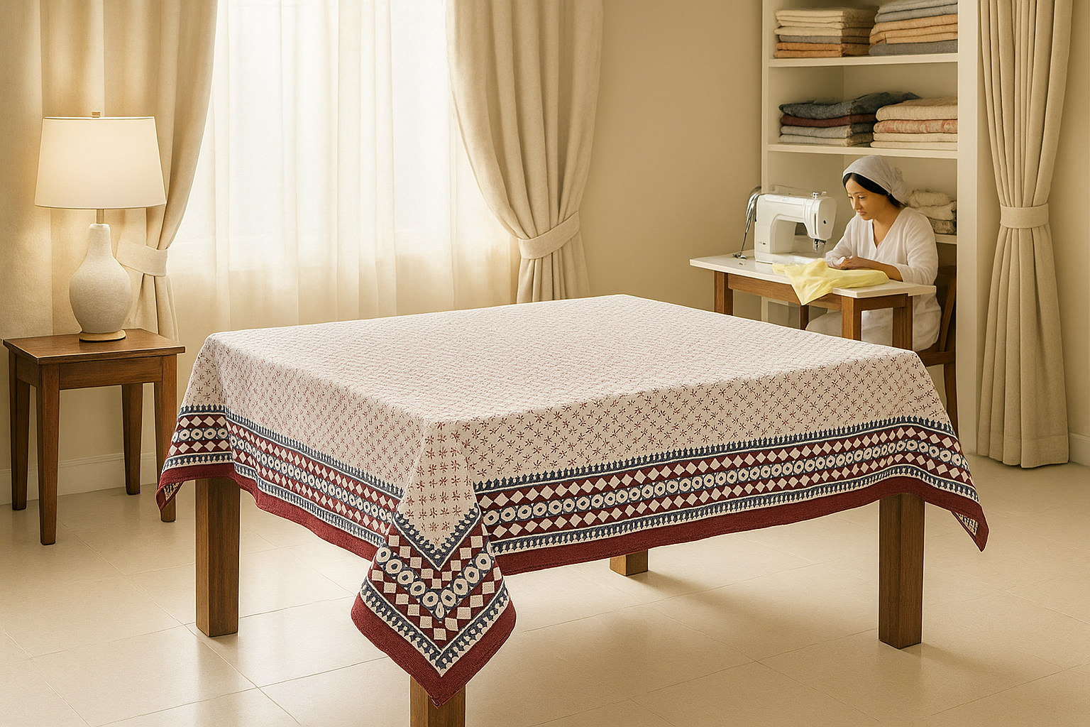 Add a touch of quiet sophistication to your dining space with this hand block printed cotton table cover. Bring home the charm of heritage crafts with this hand block printed table cover, featuring traditional jal and bold geometric patterns. Lovingly made by rural women artisans, this piece showcases a stunning layout of concentric circles, diamond shapes, and border detailing in earthy maroon and indigo on a textured off-white base. This artisanal table cover is made using natural cotton and eco-friendly dyes. The strong pattern and rustic fabric make it ideal for everyday use as well as special gatherings-adding warmth, culture, and character to your dining space.