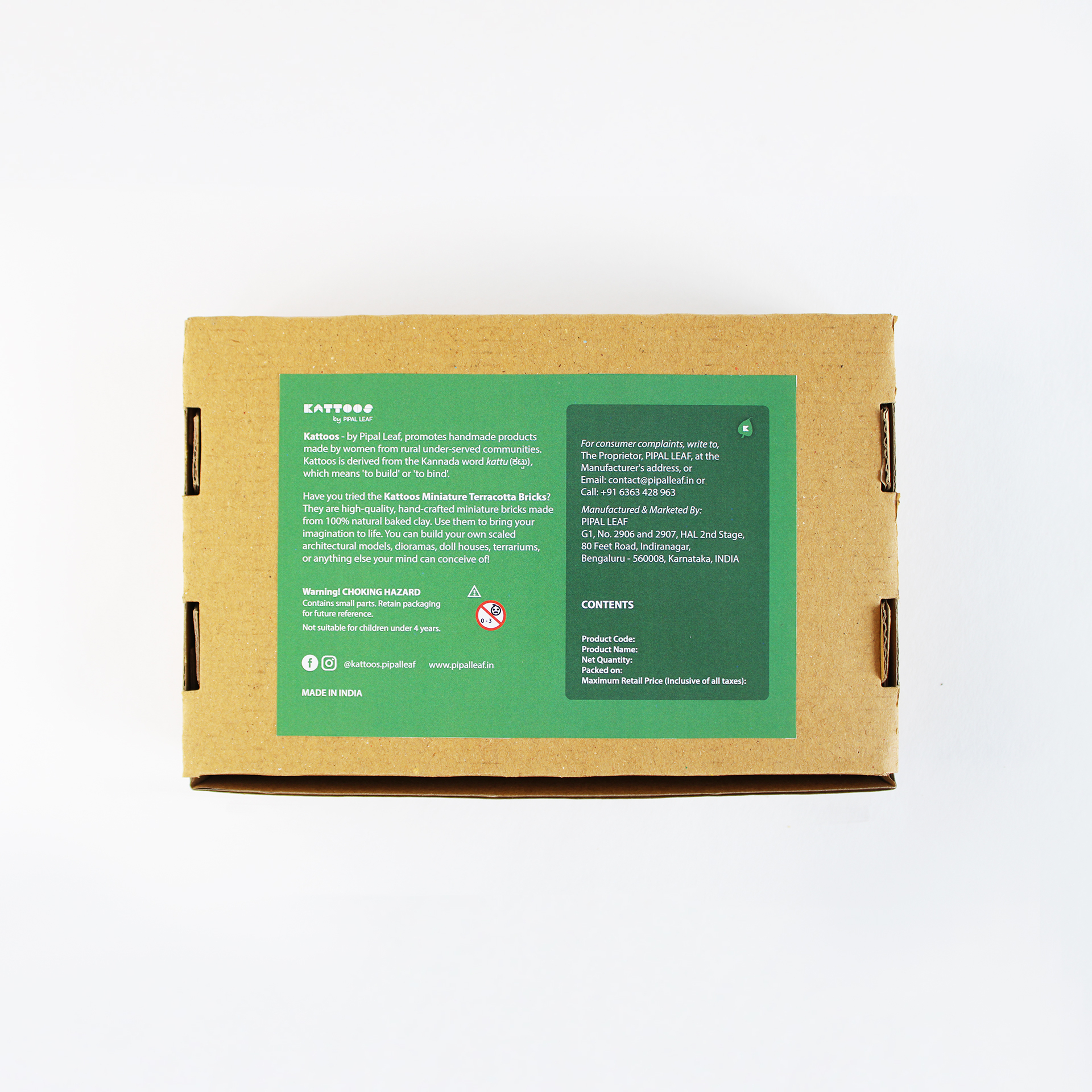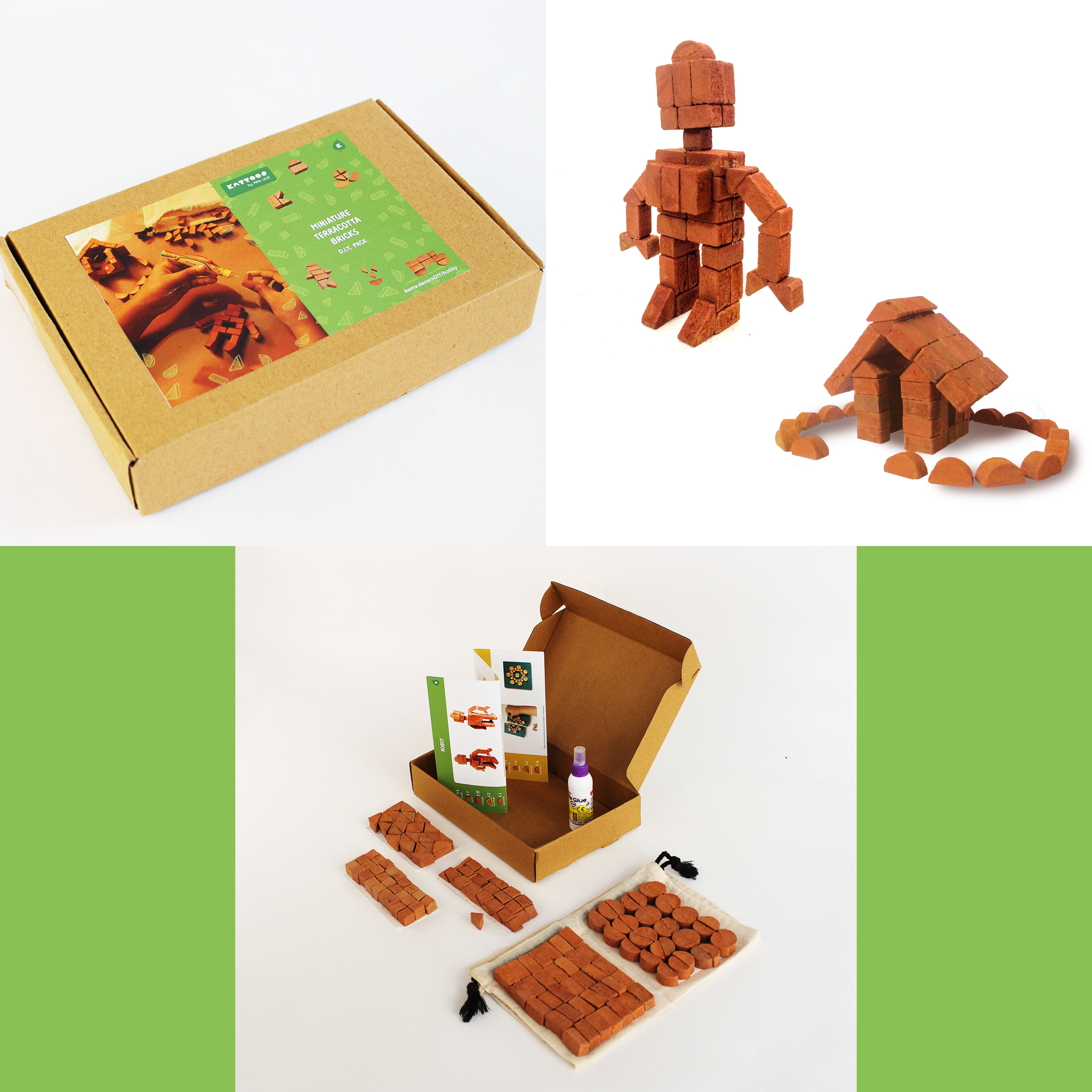 Kattoos Miniature Terracotta Bricks D.I.Y. Gift Pack comes in 3 vibrant label options (Purple, Yellow and Green). The box and contents remain the same, only the box label colour varies.