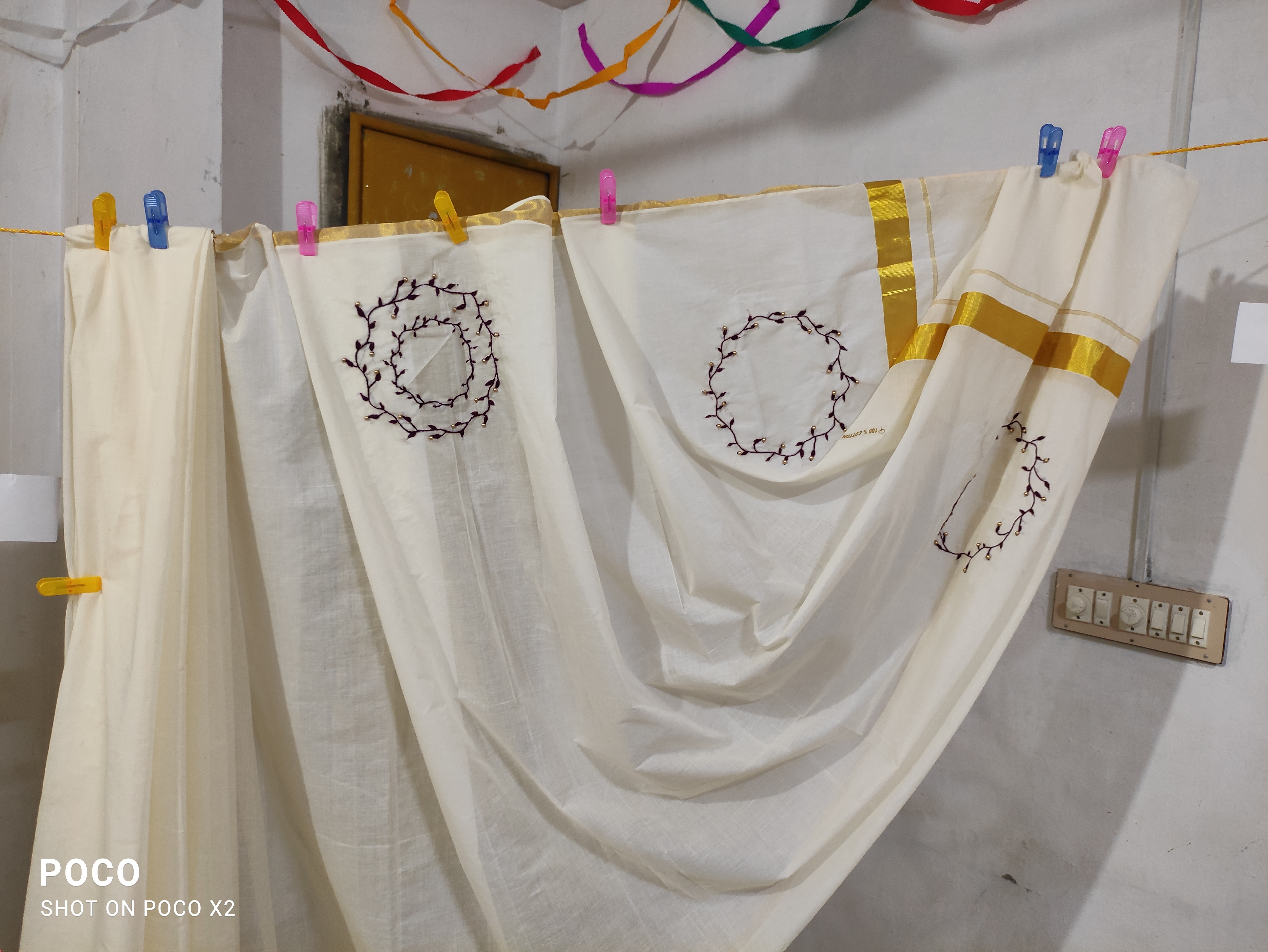 Kerala Handmade Cotton Kasavu Saree with Embroidery | Off White