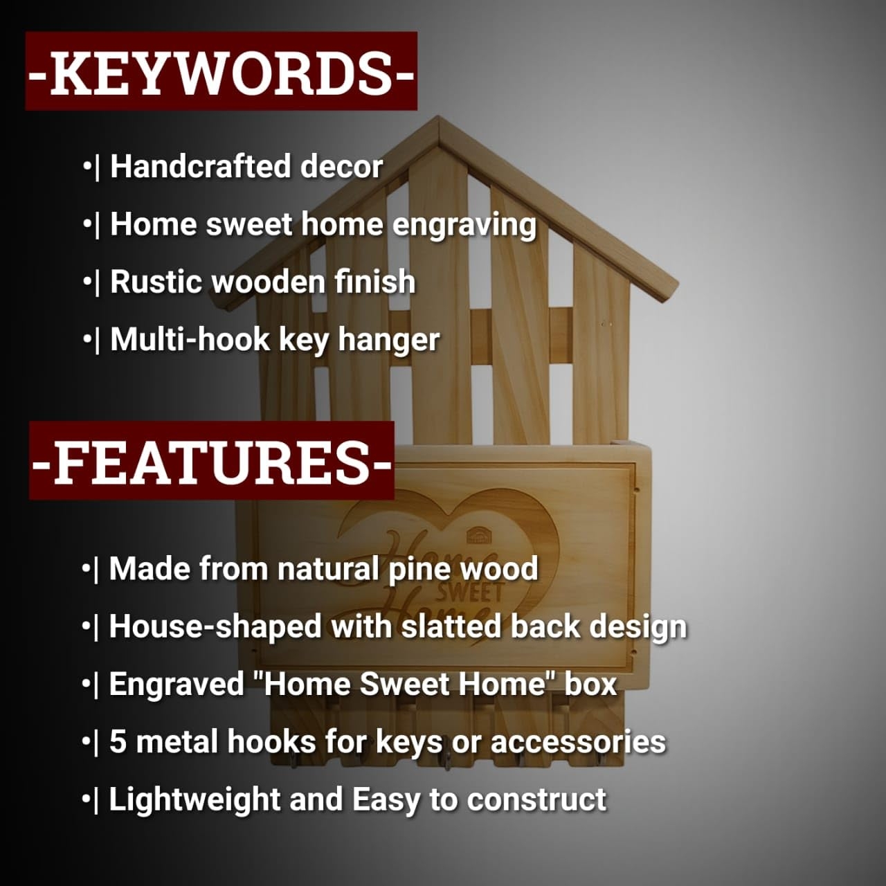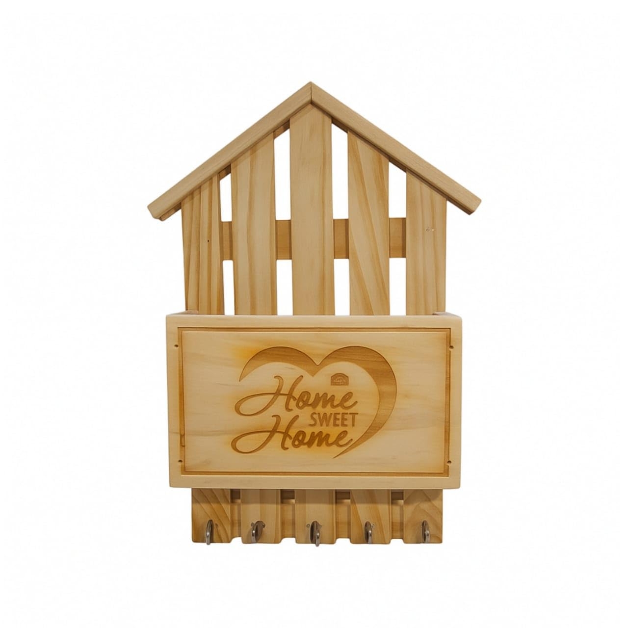 - RUSTIC DESIGN: Beautiful house-shaped key holder crafted from natural pine wood with a charming 'Home Sweet Home' engraving in a heart design