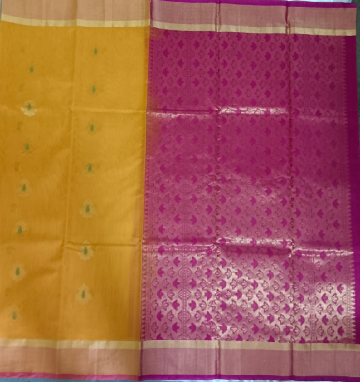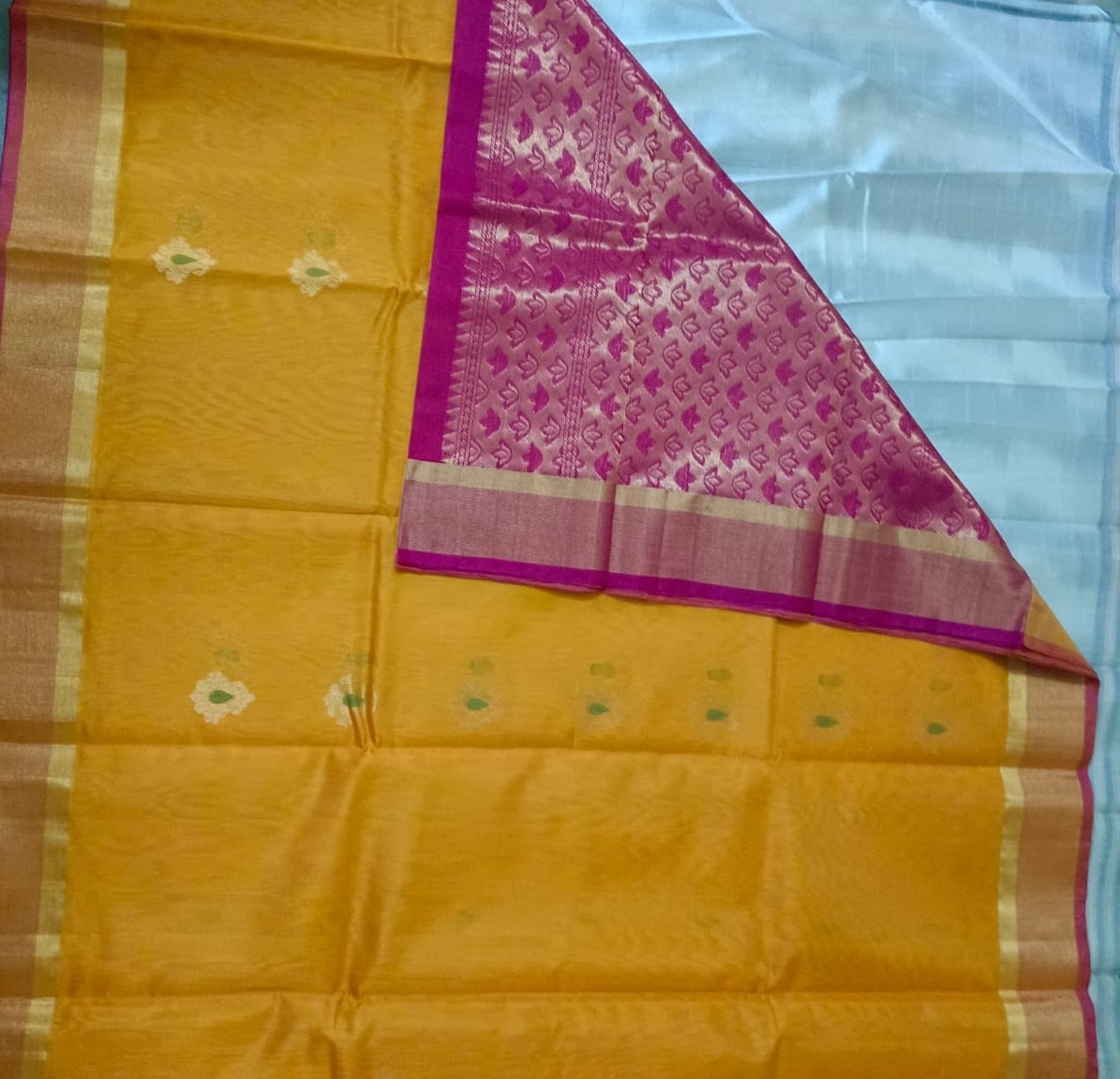 Kora Cotton Sarees is light weight product. Dyed mulberry raw silk yarn (Kora) is used in warp and superior quality mercerized cotton yarn is used in weft giving crisp handle with elegant look. The Sarees have bright coloured border designs with occasional use of shining jari. They are woven on fly shuttle raised pit looms fitted with jacquard mechanism.