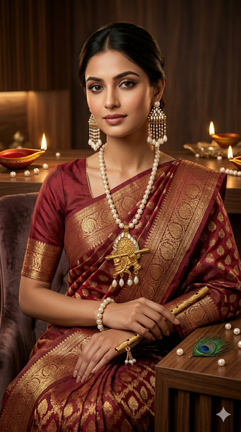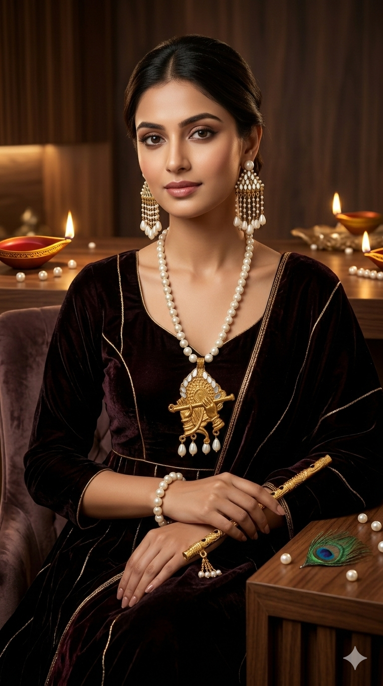 - Design Theme: Inspired by Lord Krishna, the central pendant features a beautifully crafted golden silhouette of Krishna playing the flute, adorned with intricate traditional motifs.