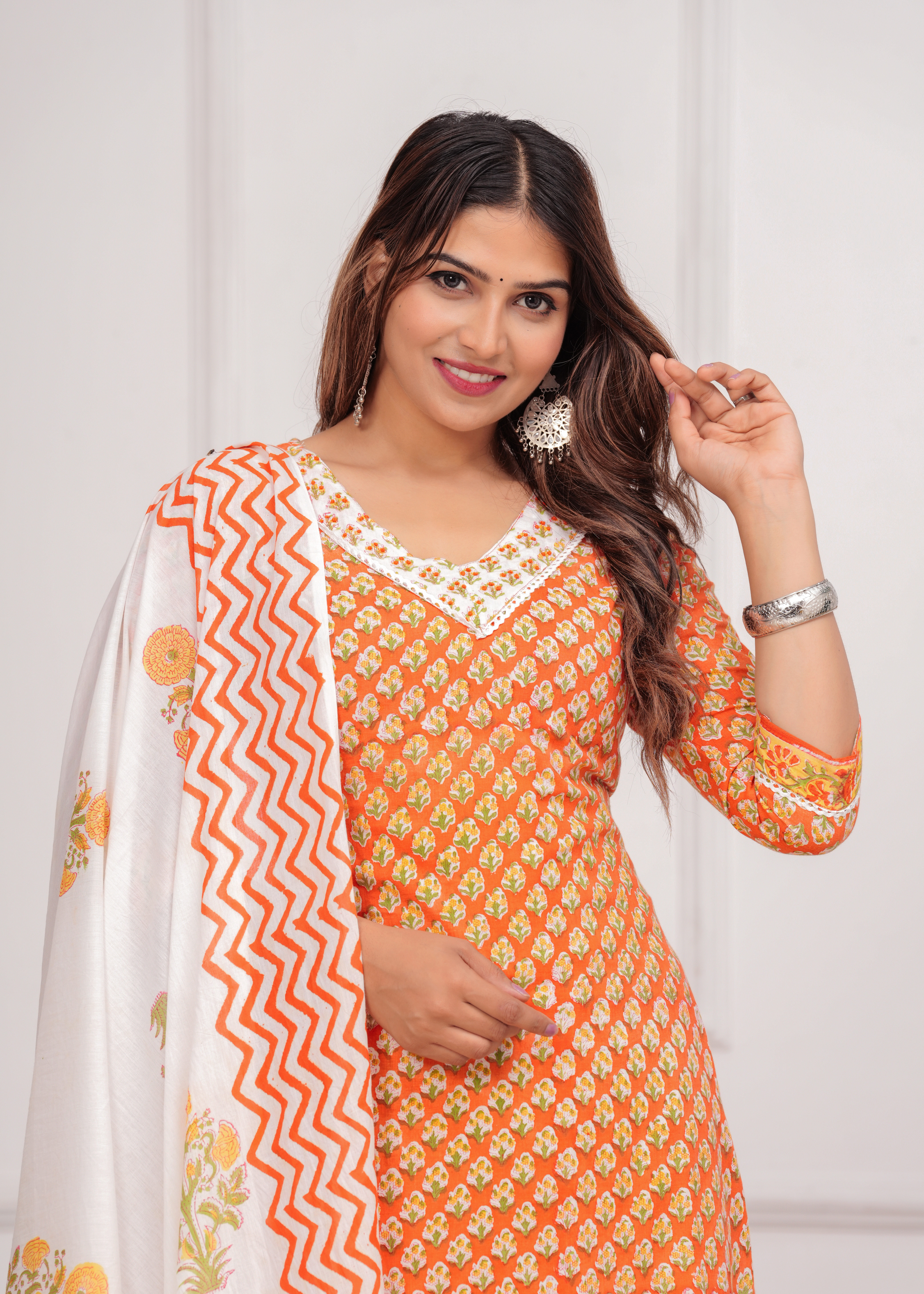 Pure Cotton Kurta Set | Hand Printed | Orange