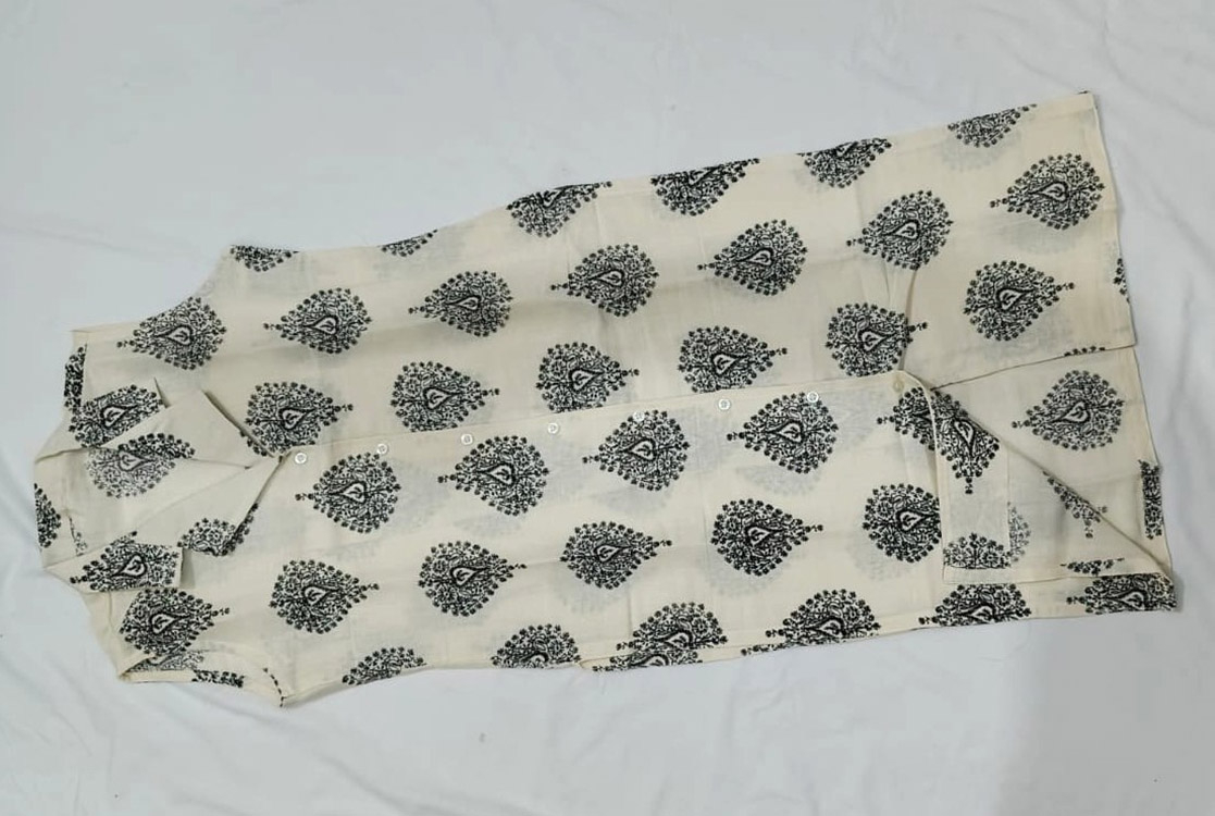 A handloom-made front open kurtha crafted from a soft cotton–linen blend, featuring delicate screen-printed floral patterns. The textured fabric and flowing panel silhouette offer an elegant, airy look with artisanal charm