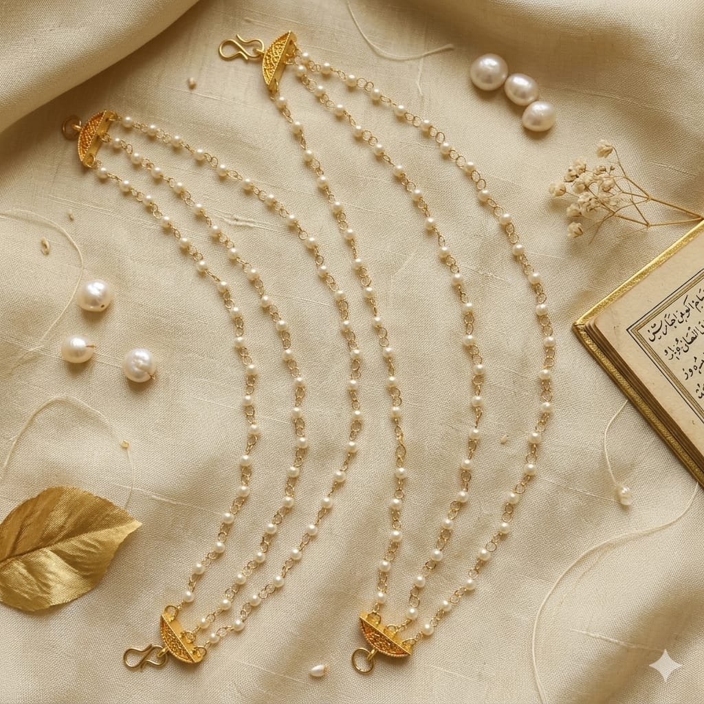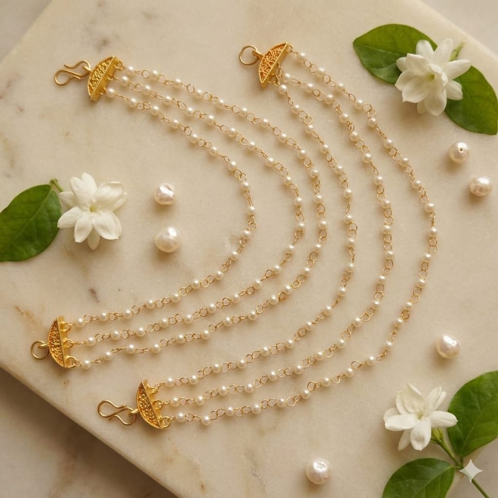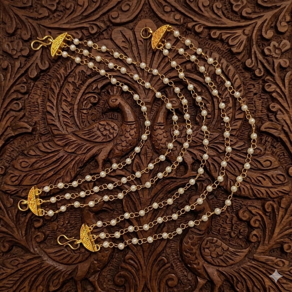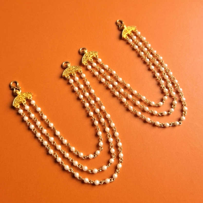 Enhance your ethnic look with this layered ear chain featuring a gold-tone finish and multiple strands. The cascading design creates a balanced and structured appearance that complements traditional outfits. The semi-circular textured connectors add a subtle design element, while the fine chain links provide flexibility and a smooth drape. Lightweight construction ensures comfortable wear for long hours. Suitable for pairing with sarees, lehengas, and festive attire. Ideal for weddings, festivals, and traditional occasions.