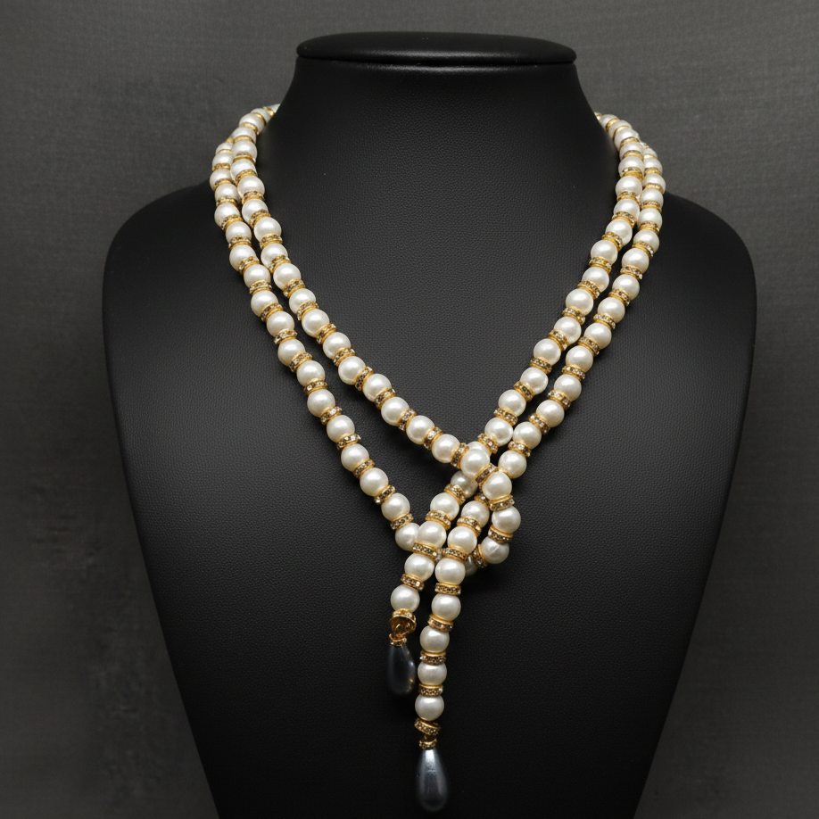 Multi-Layer Pearl Design: Long white pearl strands accented with golden spacers for a luxurious finish.