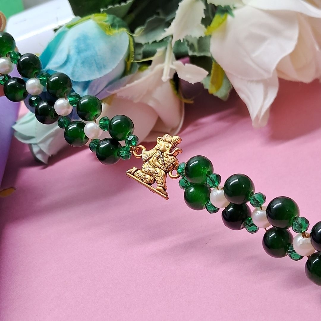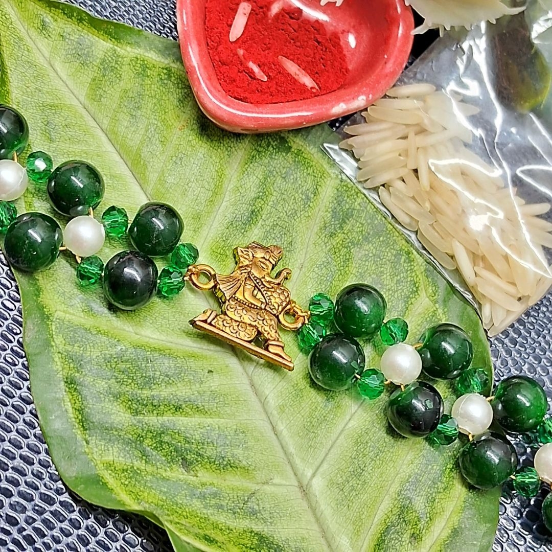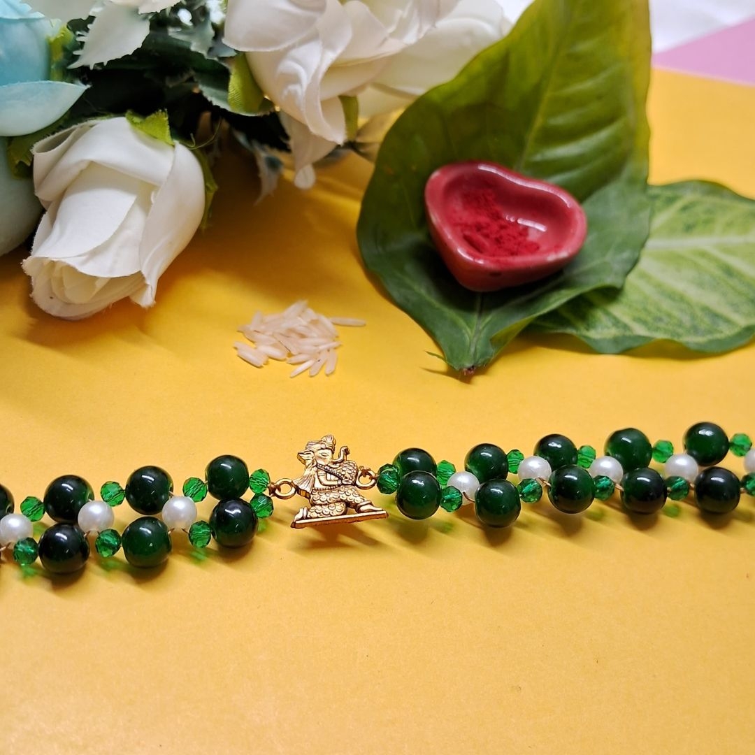 Celebrate Raksha Bandhan with this beautifully handcrafted bracelet-style Rakhi, designed to combine tradition with a touch of modern elegance. Featuring a double-strand layout of vibrant green and white beads, this Rakhi is adorned with a detailed Lord Ganesha charm, symbolizing divine love and protection.