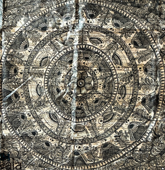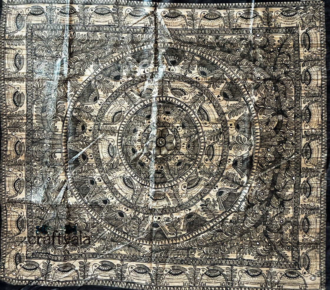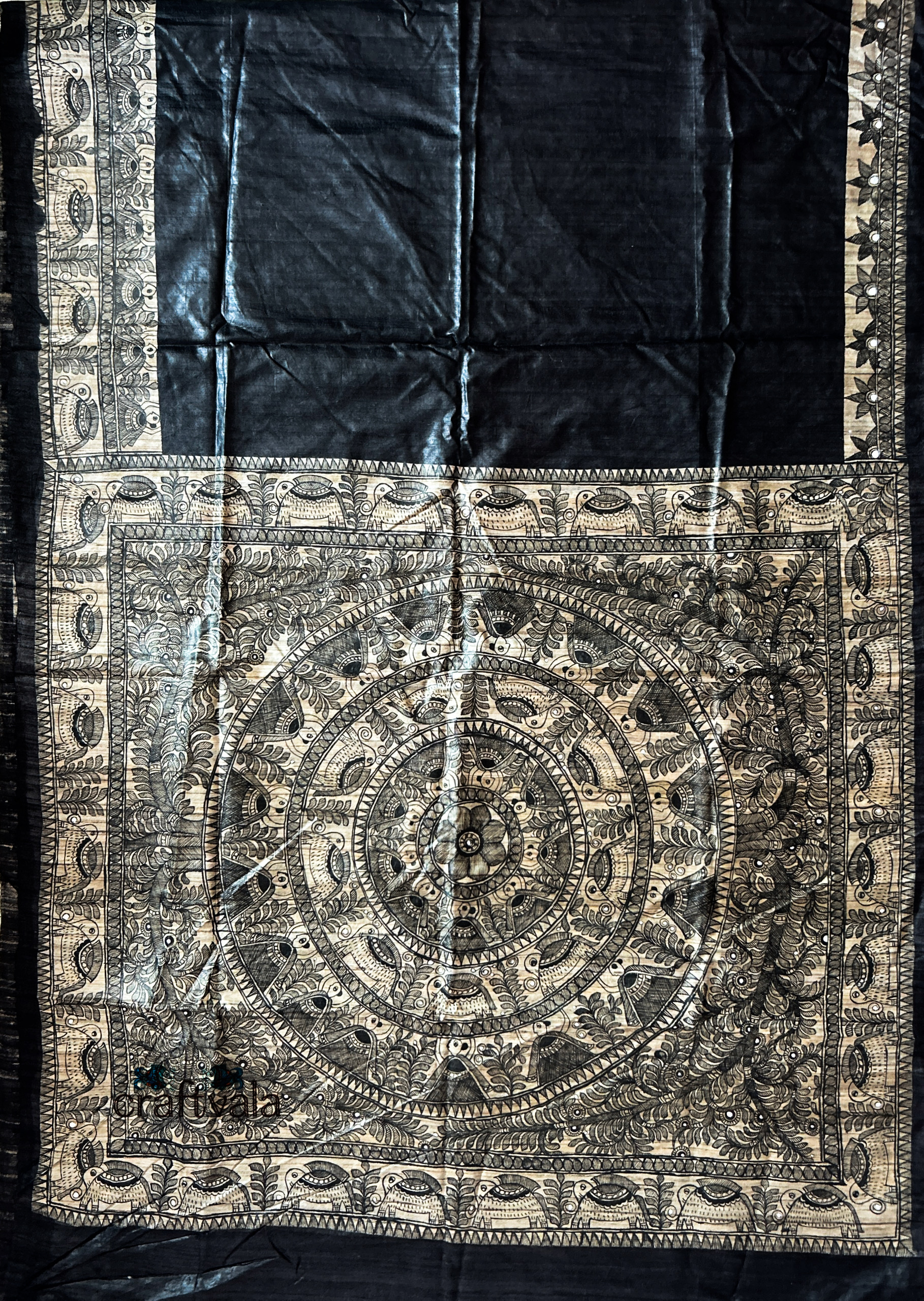 Handwoven Madhubani Tasar Ghicha Silk Saree With Hand-Painted Taraditional Madhubani Painting.