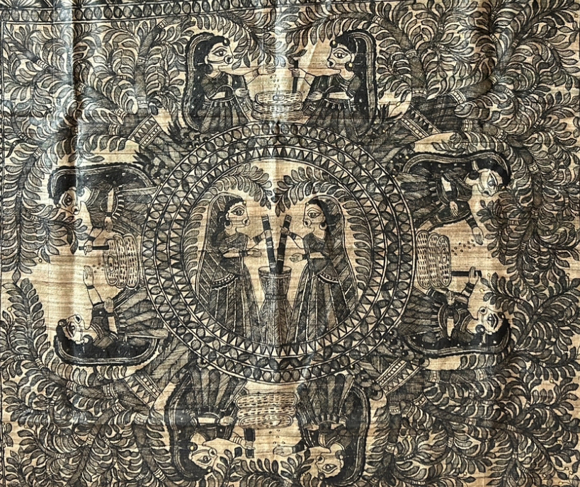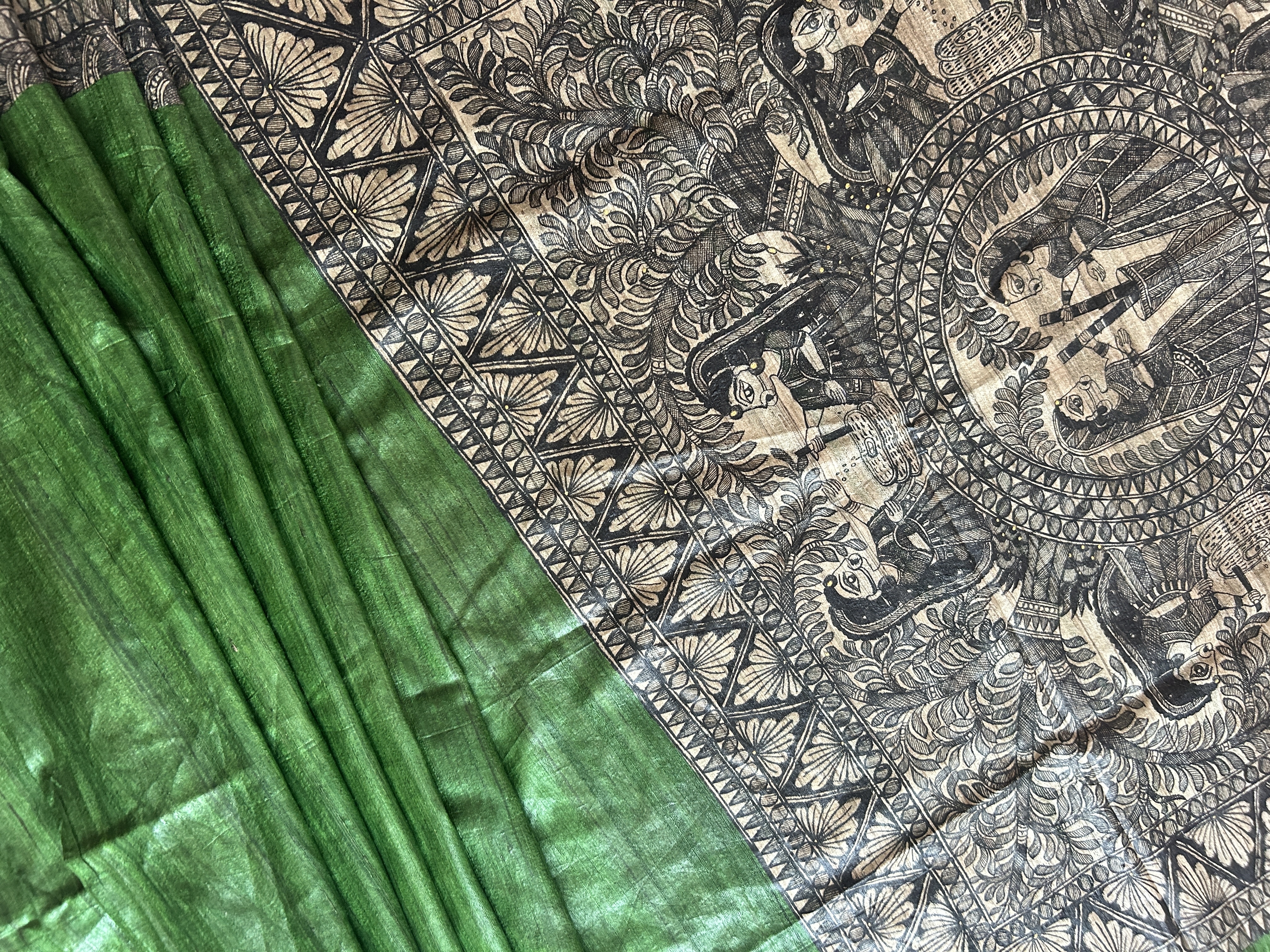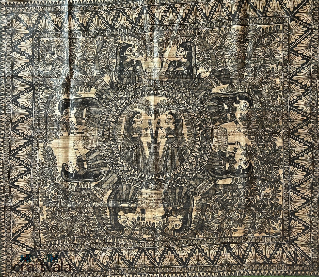 Handwoven Madhubani Tasar Ghicha Silk Saree With Hand-Painted Taraditional Madhubani Painting.