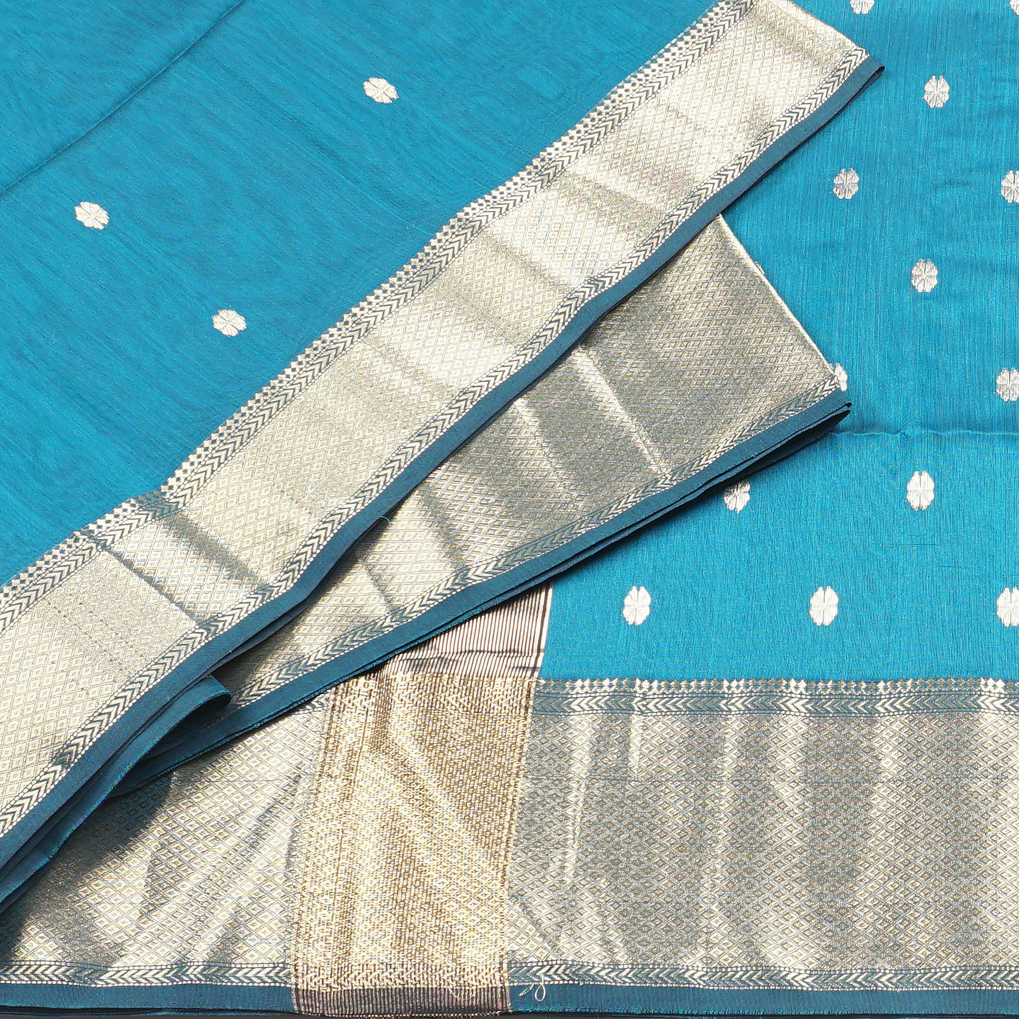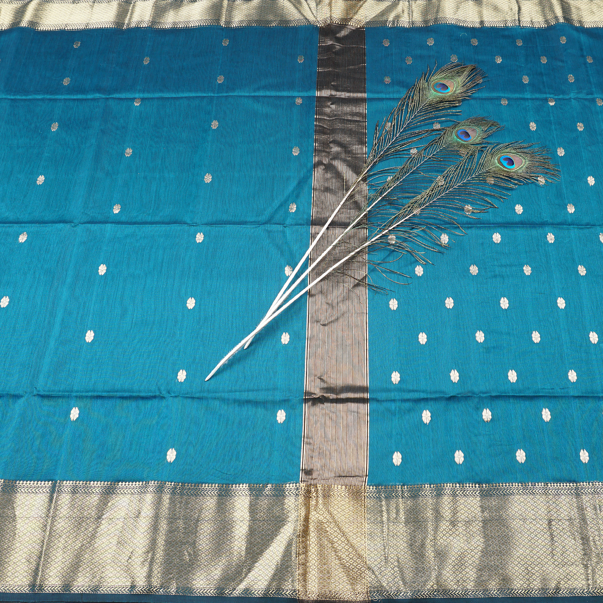 BIG DIAMOND ZARI BORDER, SMALL FLOWER MOTIFS ALL OVER THE SAREE, COTTON SILK FABRIC WITH BLOUSE.