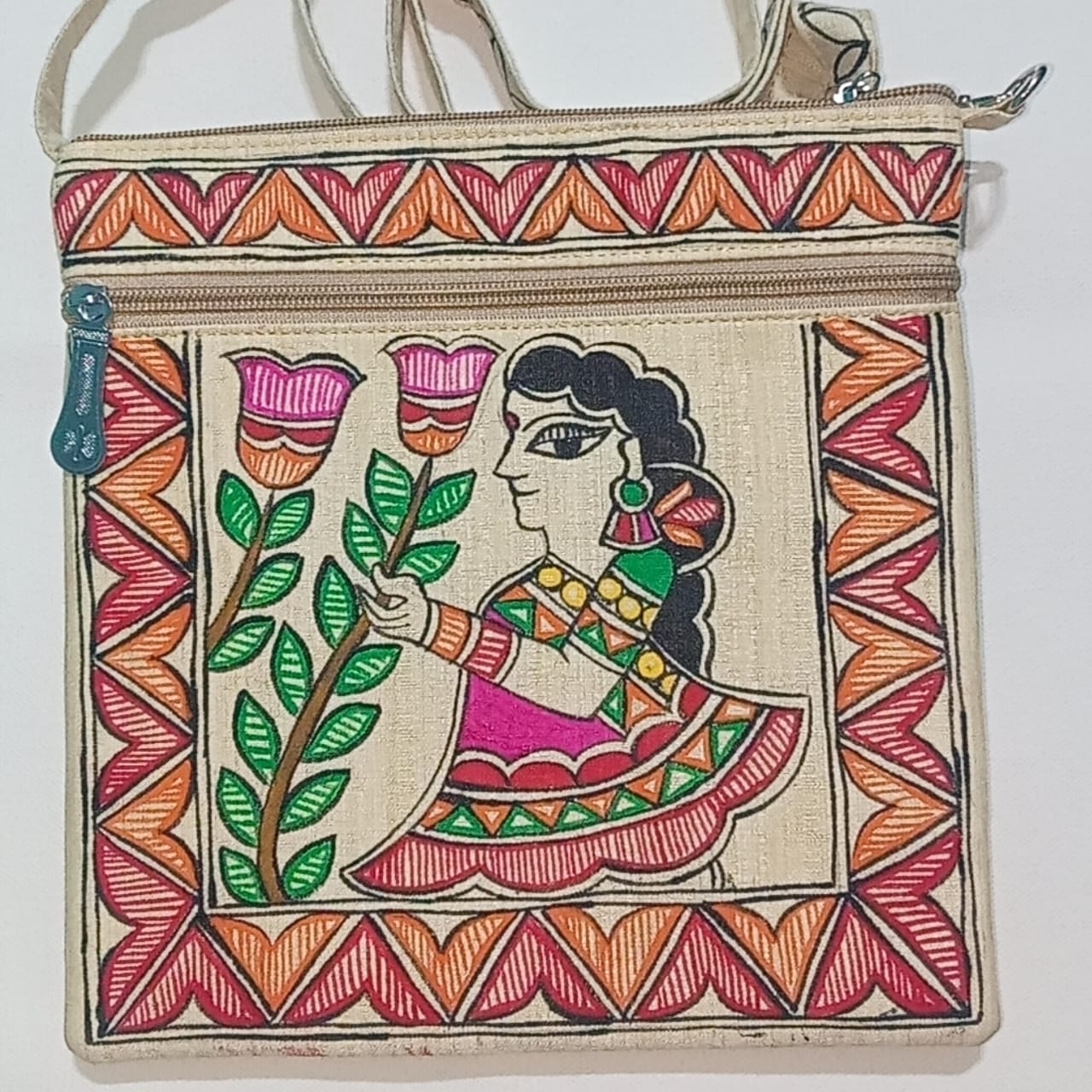 Made with slik cotton fabric and decorated with madhubani painting. Eco friendly and washable bags for casual use.