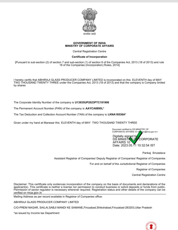 Abhiraji Glass Producer Company Limited is a Private Limited Company and was incorporated on May 10, 2023 in India. It is registered at Registrar of Companies, ROC Kanpur. Its corporate identification number is (CIN) U13935UP2023PTC181906 and its current status is Active. Its industry classification as per MCA is mINING OF METAL ORES.