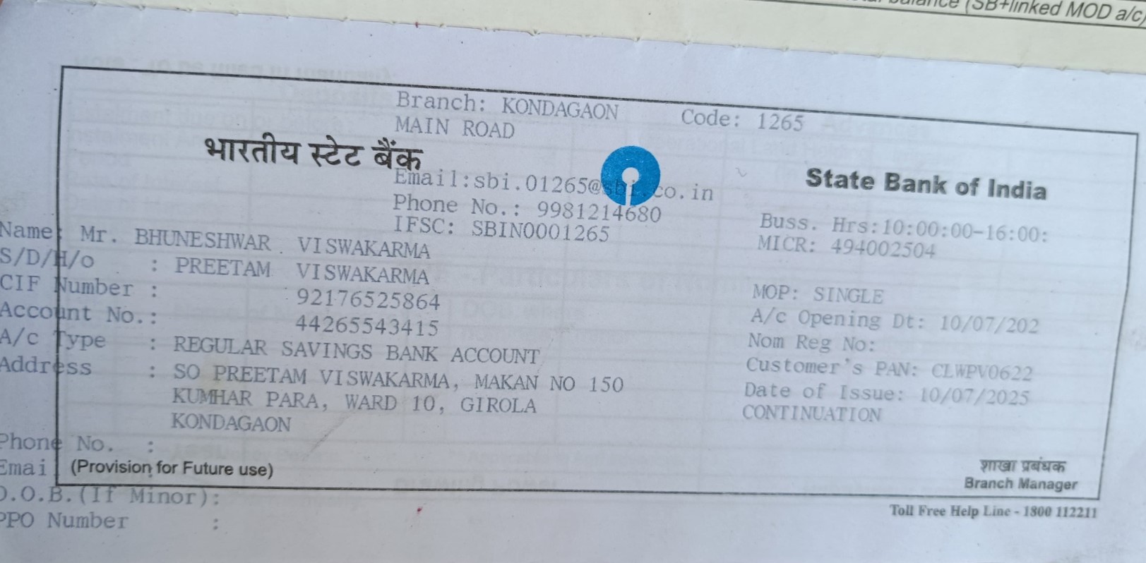 | Account Holder Name | BHUNESHWAR VISWAKARMA |