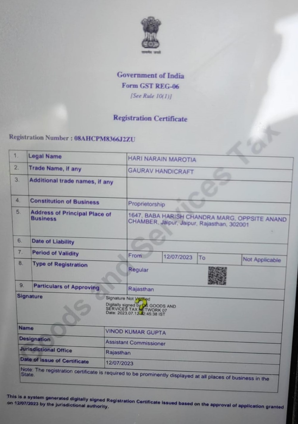 GST/Enrollment ID 08AHCPM8366J2ZU