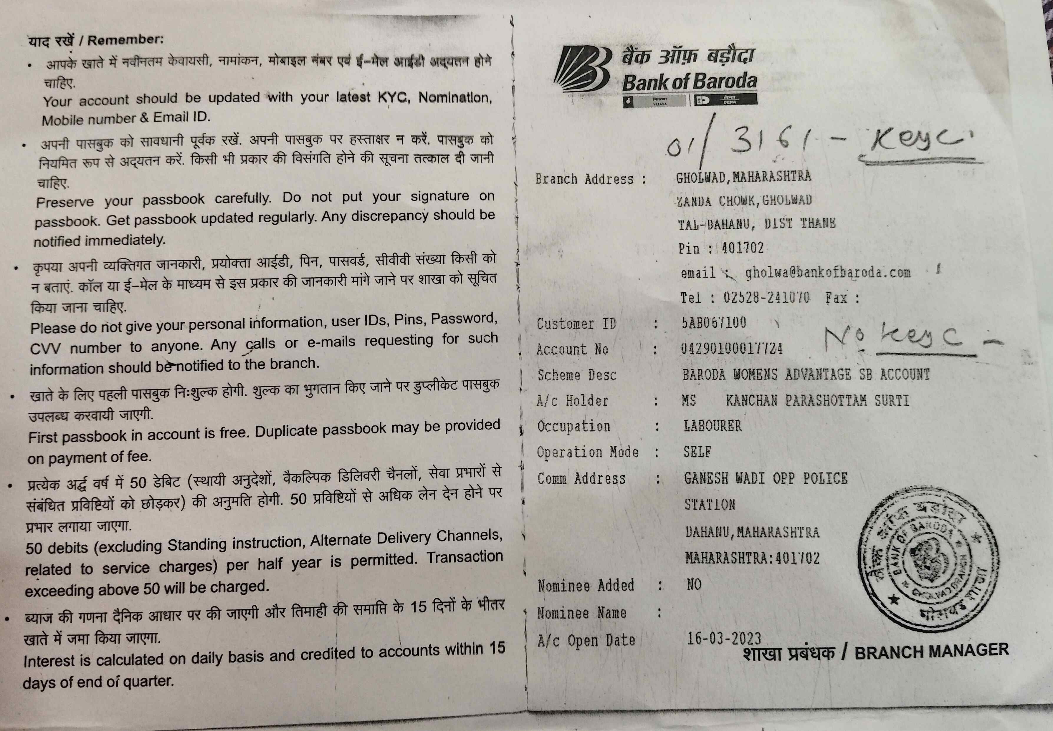 | Account Holder Name | KANCHAN PARASHOTTAM SURTI |