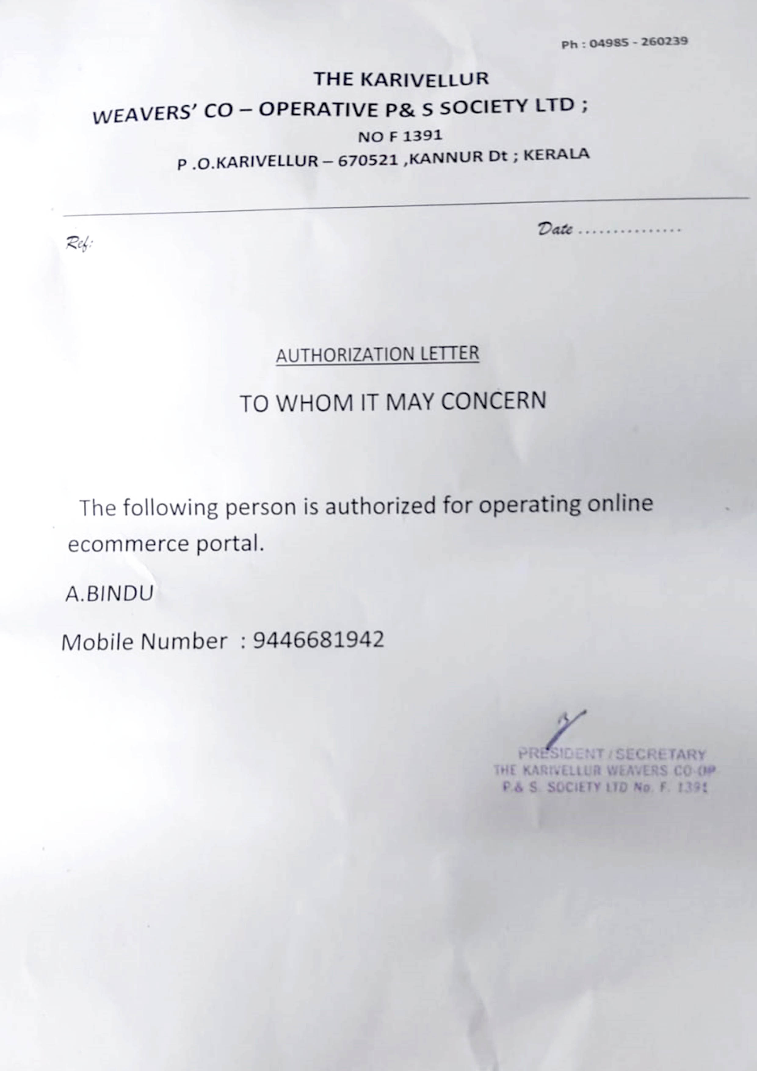 The Karivellur Handloom Weavers Cooperative P & S Society Ltd No F 1391