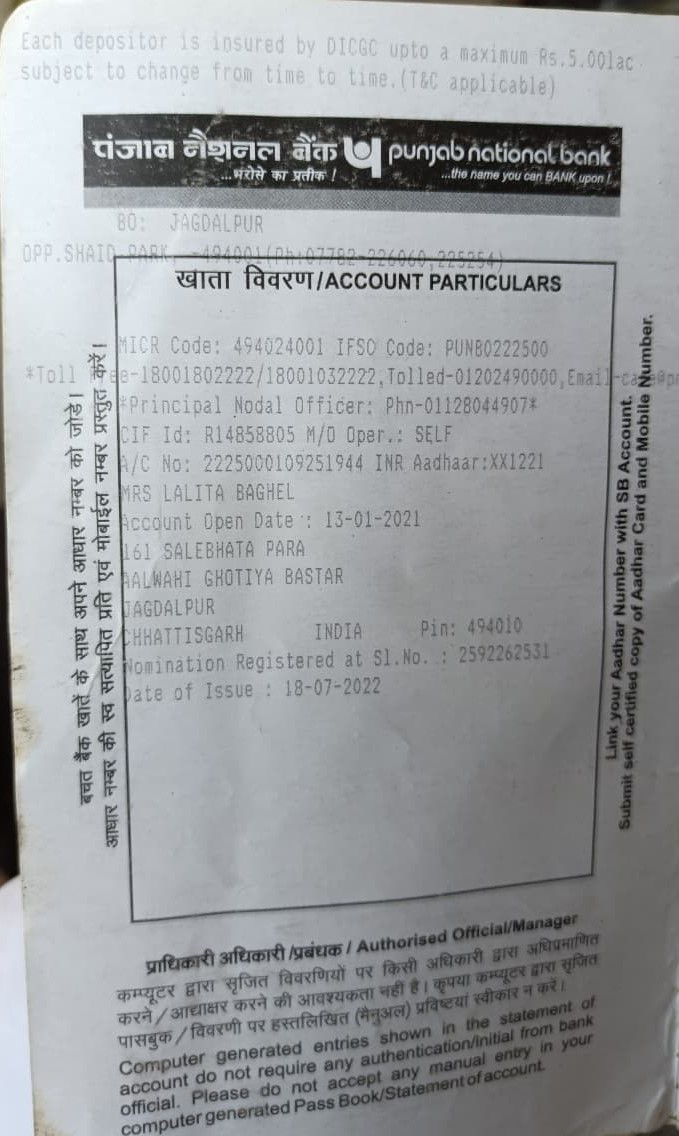 | Permanent Address | GHOTIYA SALEBHATA PARA AALWAHI, BASTAR 494010 |