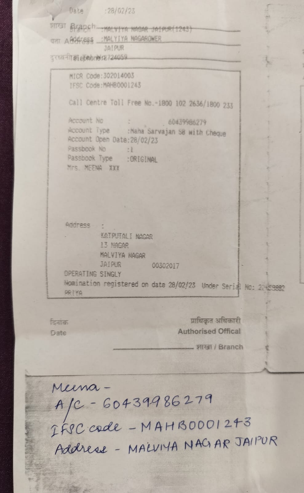 | Account Holder Name | MEENA |