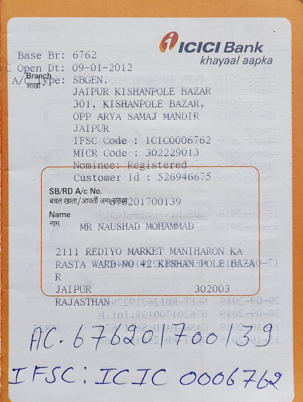 | Account Holder Name | NAUSHAD MOHAMMAD |