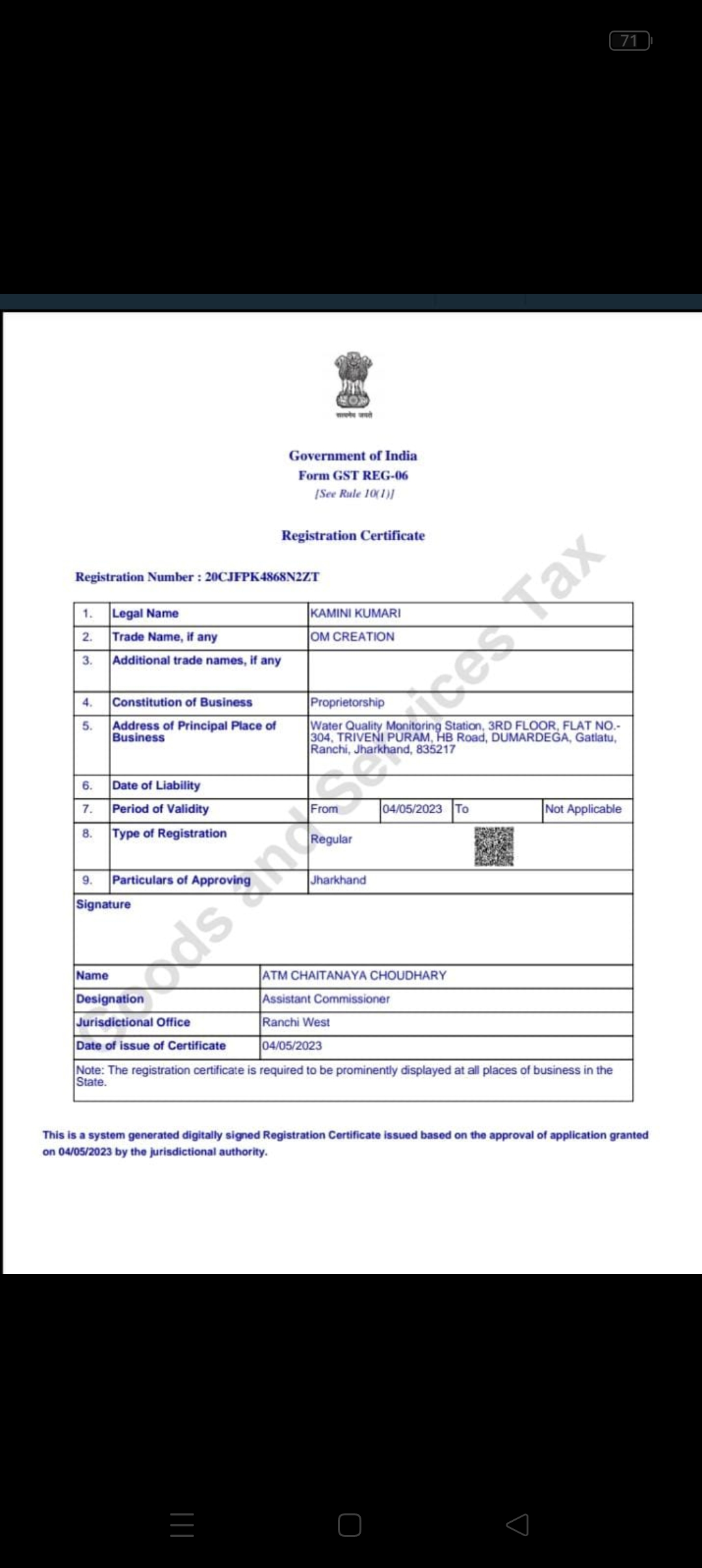 | GST/Enrollment ID | 20CJFPK4868N2ZT |