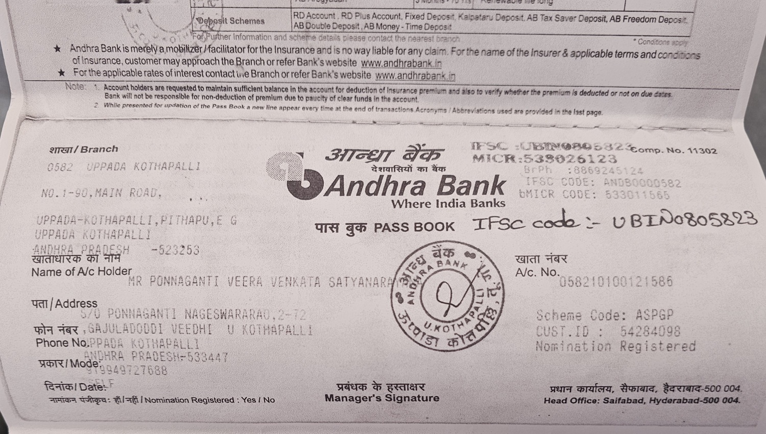 | Account Holder Name | PONNAGANTI VEERA VENKATA SATYANARAYANA |