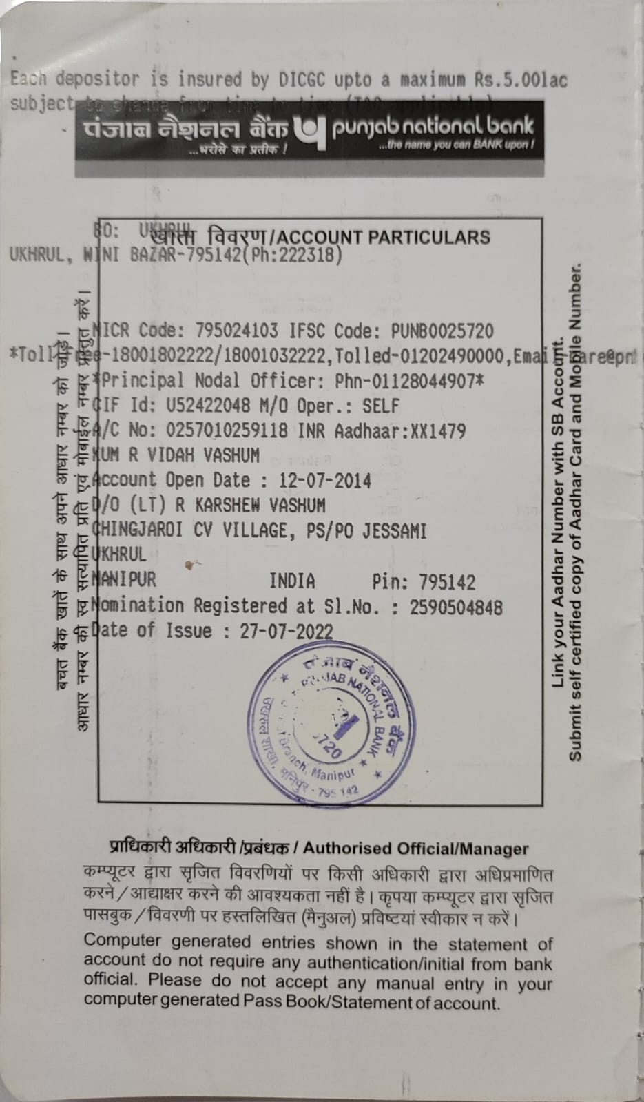 | Account Holder Name | KUM R VIDAH VASHUM |
