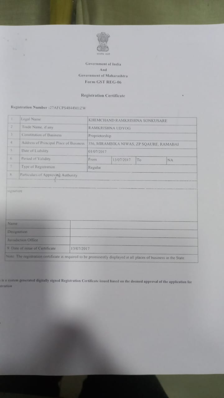 | MD / CEO / President of Organisation | Khemchand Ramkrishna Sonkusare |