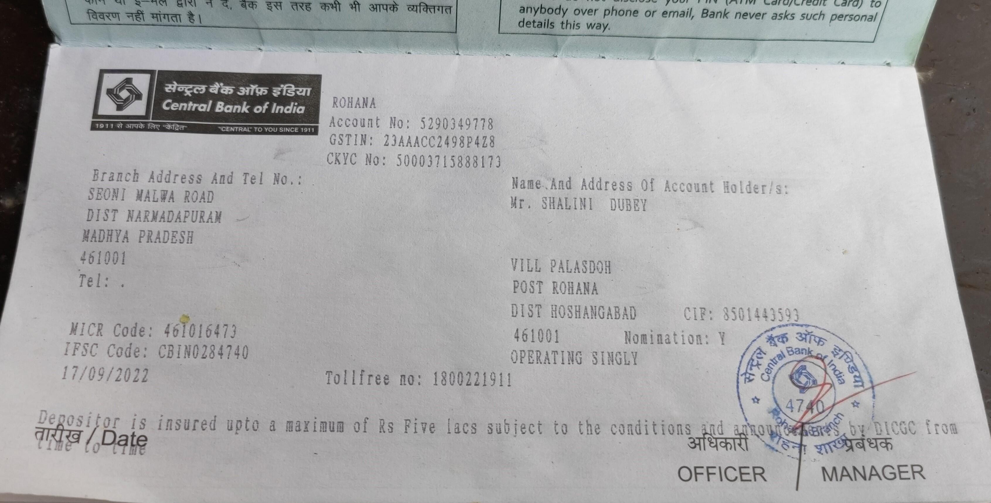 | Bank Name | Central Bank of India |