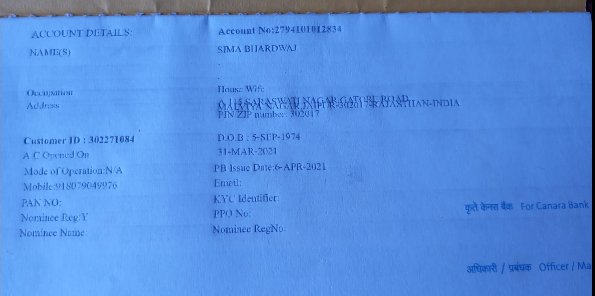 | Account Holder Name | SIMA BHARDWAJ |