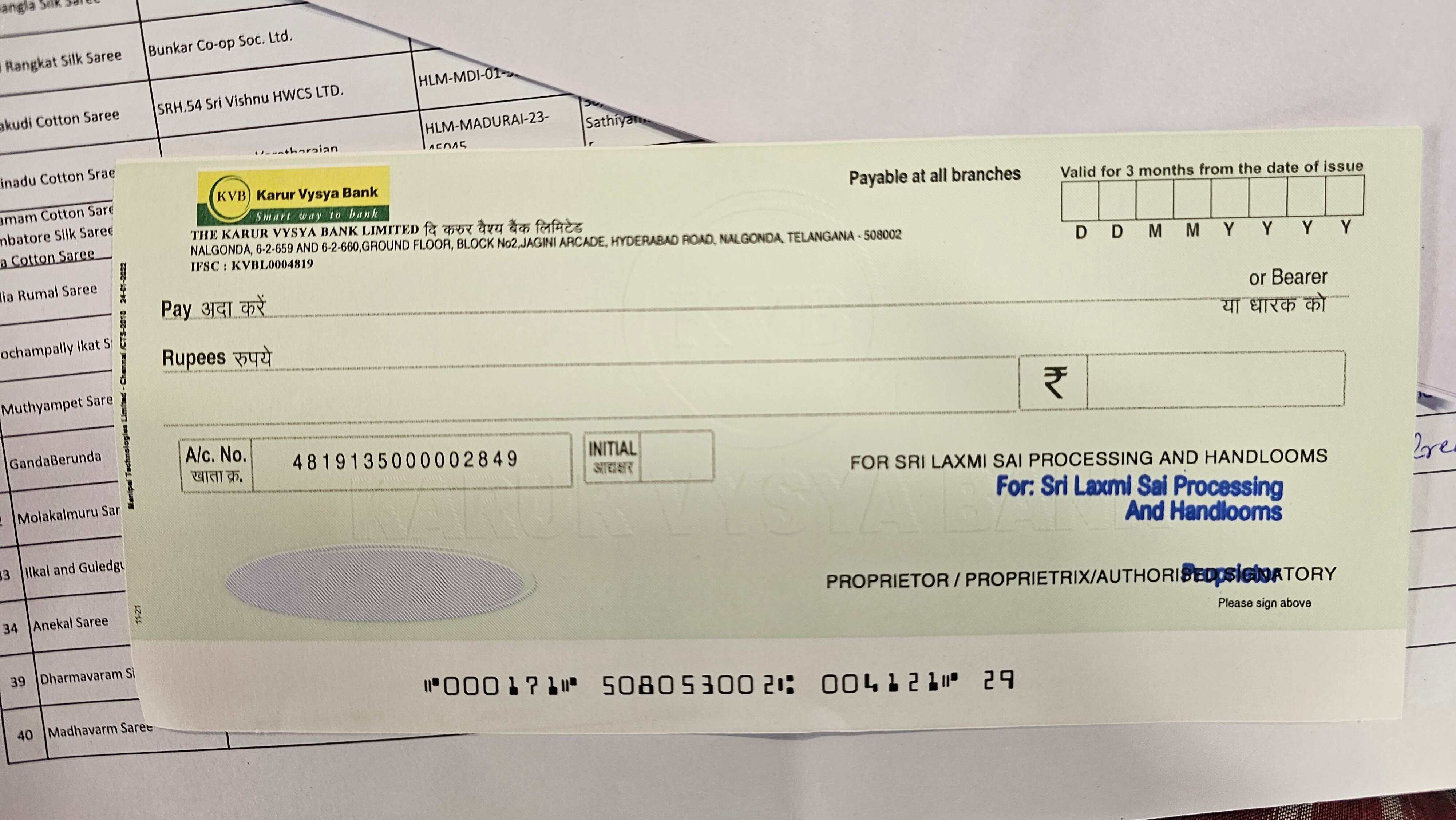 Account Holder Name SRI LAXMI SAI PROCESSING AND HANDLOOMS