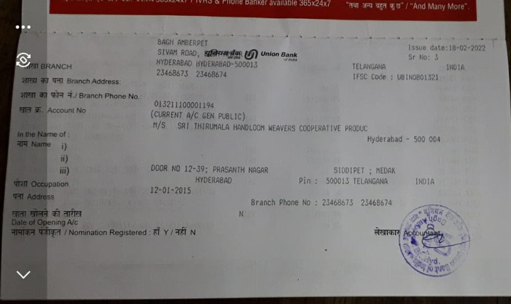 | Account Holder Name | SRI THIRUMALA HANDLOOM WEAVERS COOPERATIVE PRODUCTION AND SALES SOCIETY LTD |