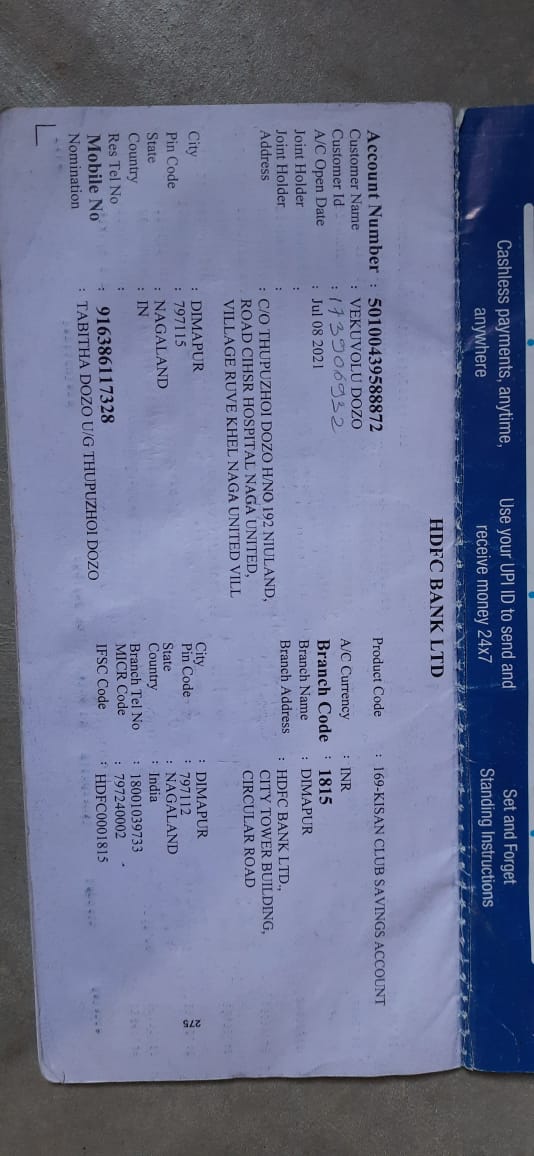 | Account Holder Name | Vekuvolu Dozo |