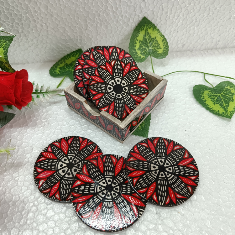 Add a touch of traditional elegance to your space with this beautifully handpainted Madhubani coaster set. Crafted on durable MDF wood, each coaster features intricate artwork inspired by folk art, bringing vibrant colors and cultural charm to your table. The set includes 6 coasters with a matching holder for neat storage. Perfect for protecting surfaces from heat and stains while enhancing your home décor, it also makes a thoughtful and artistic gift.