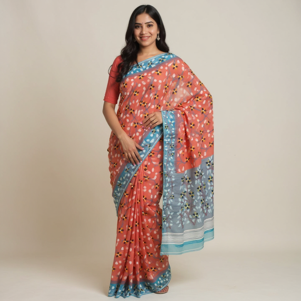 Jamdani saree is made by fine cotton count embellished by extra warp designs with multi coloured yarns. It is a simple formation of Jamdani cotton saree & woven with figured motifs, in transparent plain ground, with designs of extra warp in borders and extra weft in the body. Use of cotton yarn make it suitable to wear comfortably.