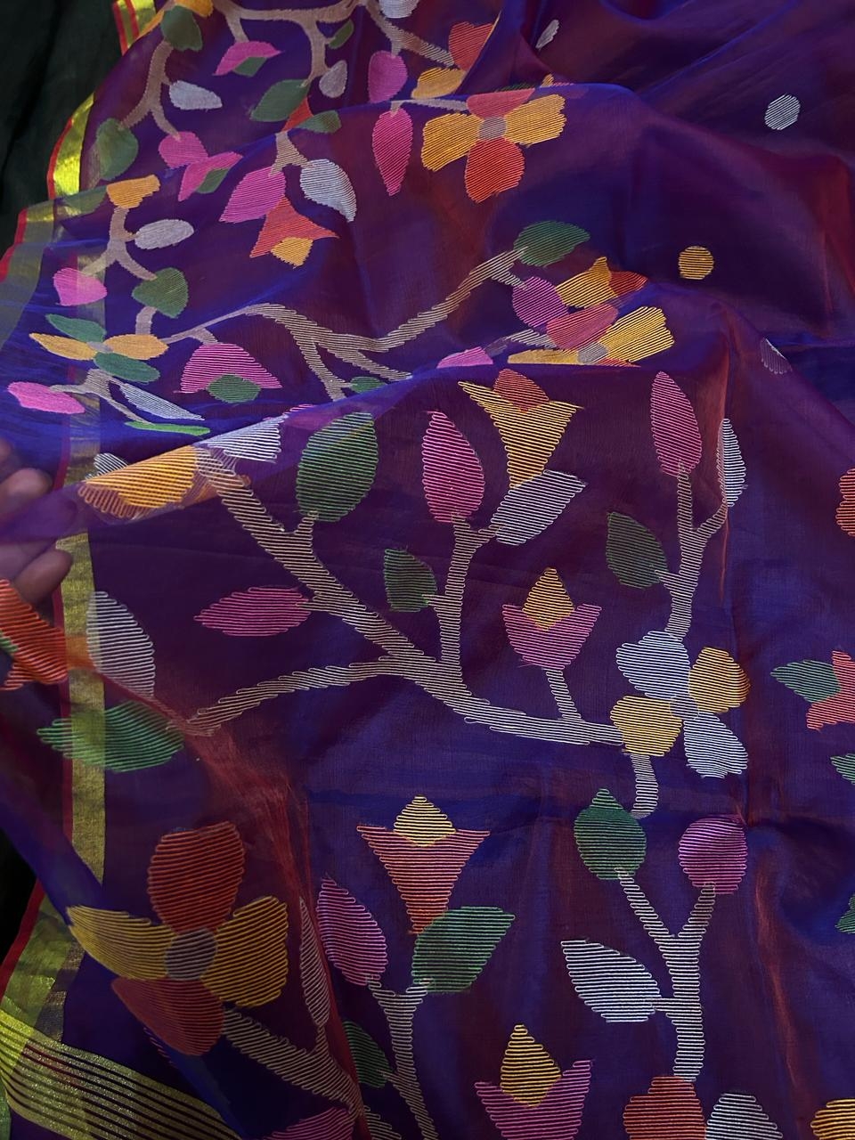 Moslin saree is made by fine cotton count embellished by extra warp designs with multi coloured yarns. It is a simple formation of cotton saree & woven with figured motifs, in transparent plain ground, with designs of extra warp in borders and extra weft in the body. Use of cotton yarn make it suitable to wear comfortably.